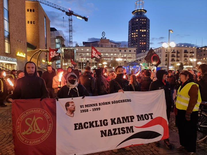 I veckan anordnade den vänsterextrema medlemsorganisationen Syndikalisterna en gemensam manifestation på Södermalm i Stockholm tillsammans med terrorstämplade AFA – till minne av den mördade vänsterextremisten Björn Söderberg, som var aktiv inom den våldsbejakande autonoma miljön under 1990-talet.