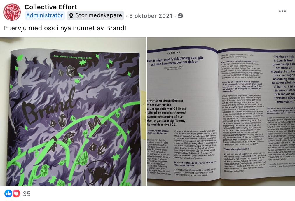 I ett nummer från 2021 av Tidningen Brand – som enligt Säkerhetspolisen står AFA nära och som har uppmanat sina läsare att ansluta sig till AFA – hyllas Collective Effort som ett exempel på hur vänsterextremister har ökat de lokala aktivisternas våldskapital.