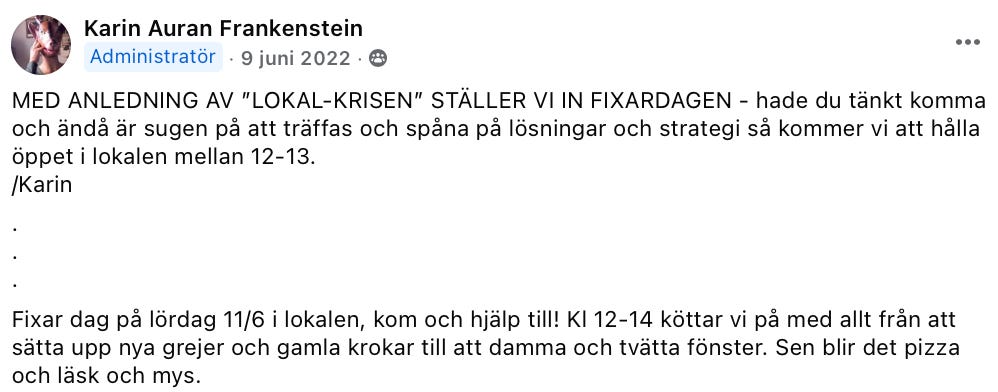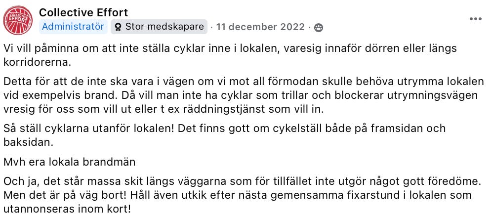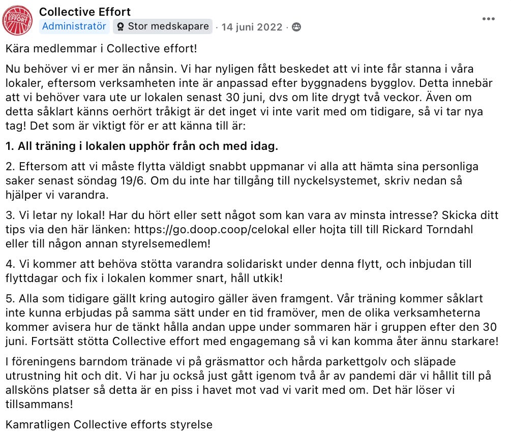 Tidigare höll Collective Effort (802513-5552) till i en industrilokal, men efter tips från civilsamhället om att deras verksamhet bröt mot fastighetens bygglov tvingades de snabbt utrymme lokalen. Efter att ha stått utan lokal i flera månader hittade de tillslut en ny i november 2022.