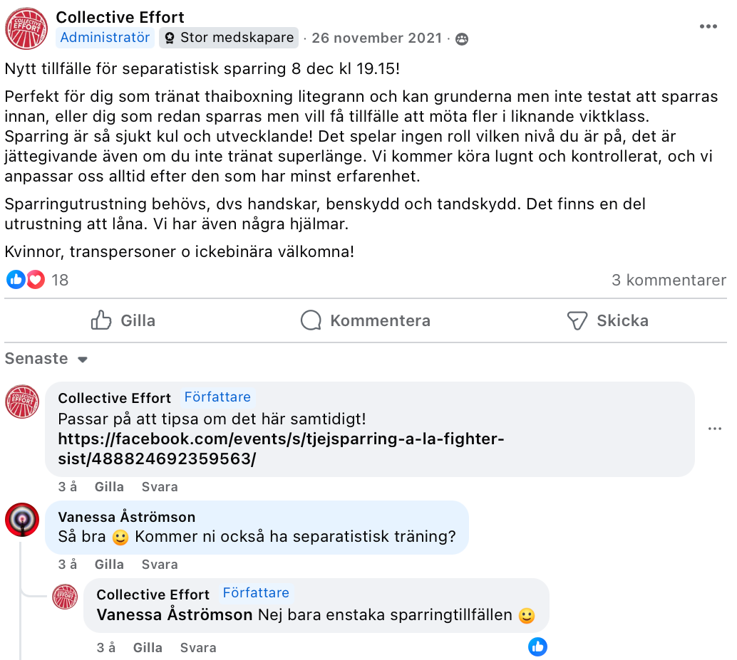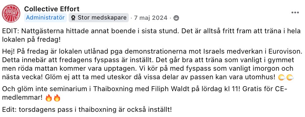 Samtidigt får våldsbejakande vänsterextremister som Collective Effort – med dokumenterade kopplingar till AFA och antisemitisk aktivism – fortsätta sin verksamhet med hjälp av kommunala lokaler och statliga subventioner genom Riksidrottsförbundet. Dessa grupper tränar stridsteknik, hyllar kommunistiska miliser och agerar vaktstyrka åt Palestinarörelsen.