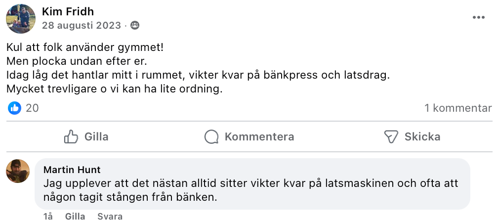 Utöver cykelkaoset fylls gruppen ofta av arga inlägg om vikter som lämnas utspridda, skivstänger som inte plockas undan och allmän oordning i lokalen.