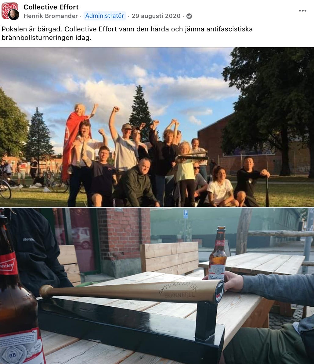 Nyligen hyllades Collective Effort i en podcast av AFA:s grundare Mathias Wåg – själv aktiv i organisationens kartläggning av meningsmotståndare. Kort därefter belönades föreningen av AFA med ett specialtillverkat basebollträ med organisationens logotyp, som tack för deltagande i en insamlingsfest där intäkterna gick till AFA:s förföljelsekampanjer.