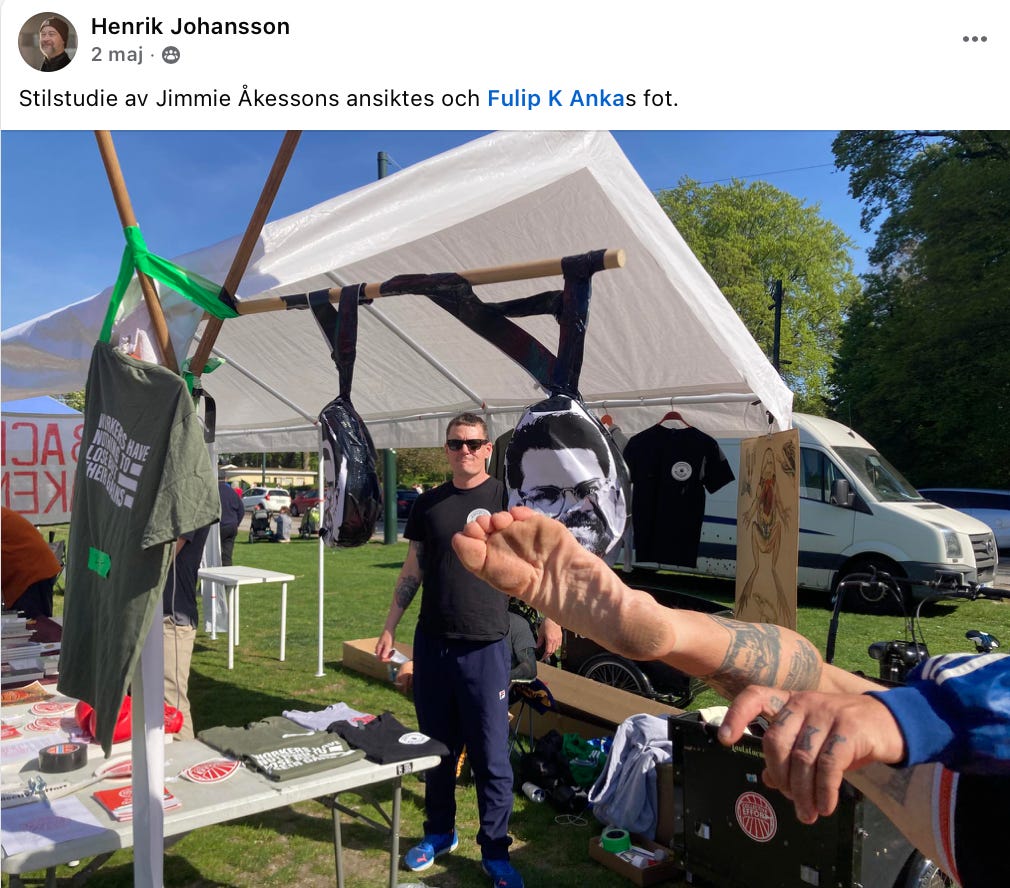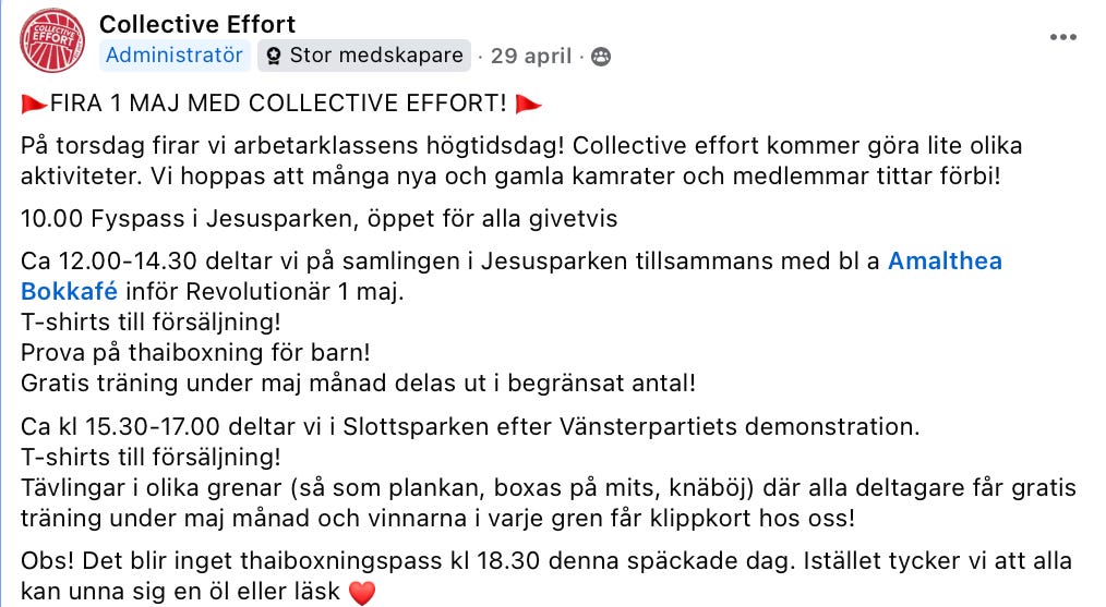 På första maj ställde Collective Effort ut i Jesusparken med andra våldsvänstergrupper, sålde kläder med politiska tryck, gymkort – och återigen stoltserandes med slagsäckar prydda med Jimmie Åkessons ansikte.