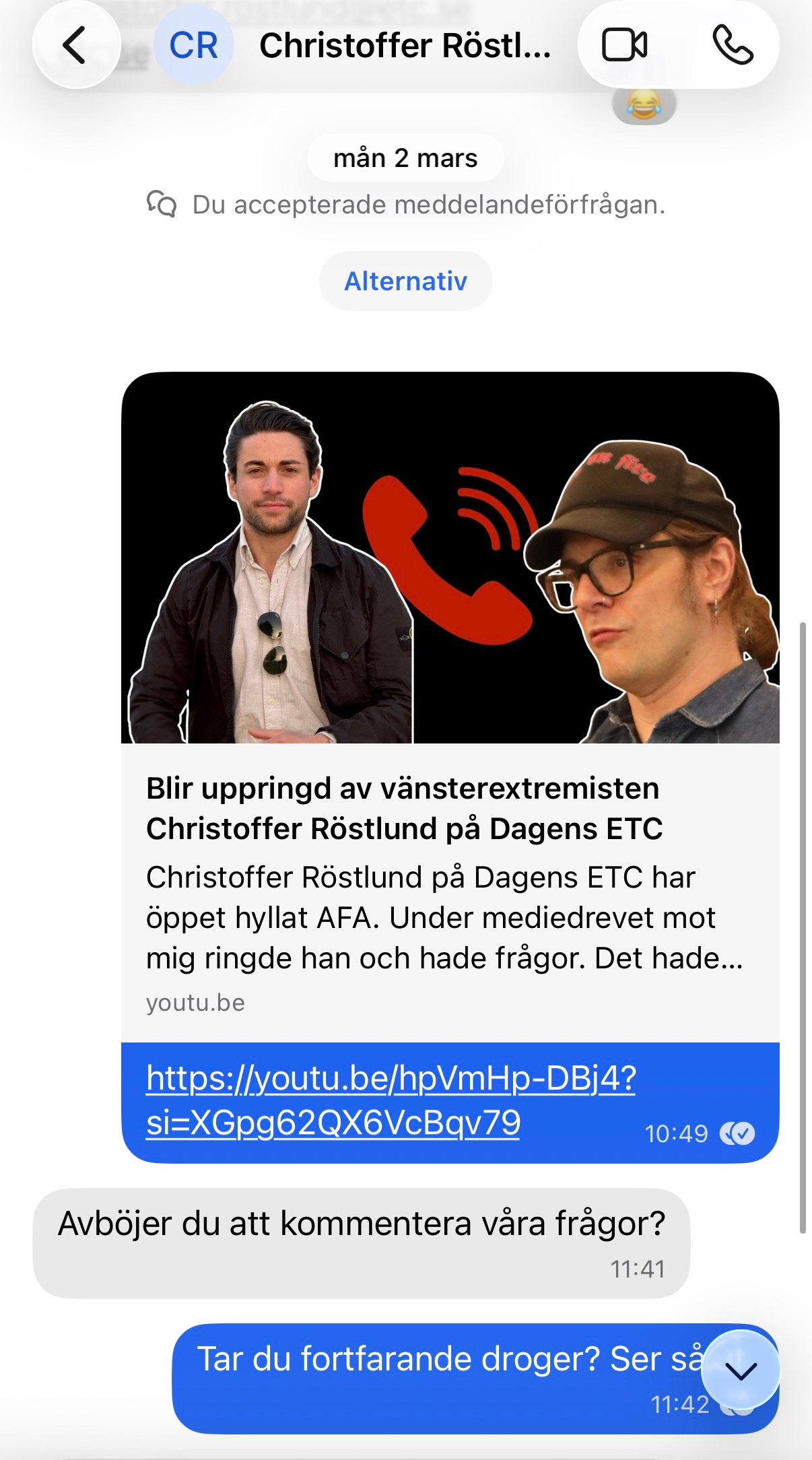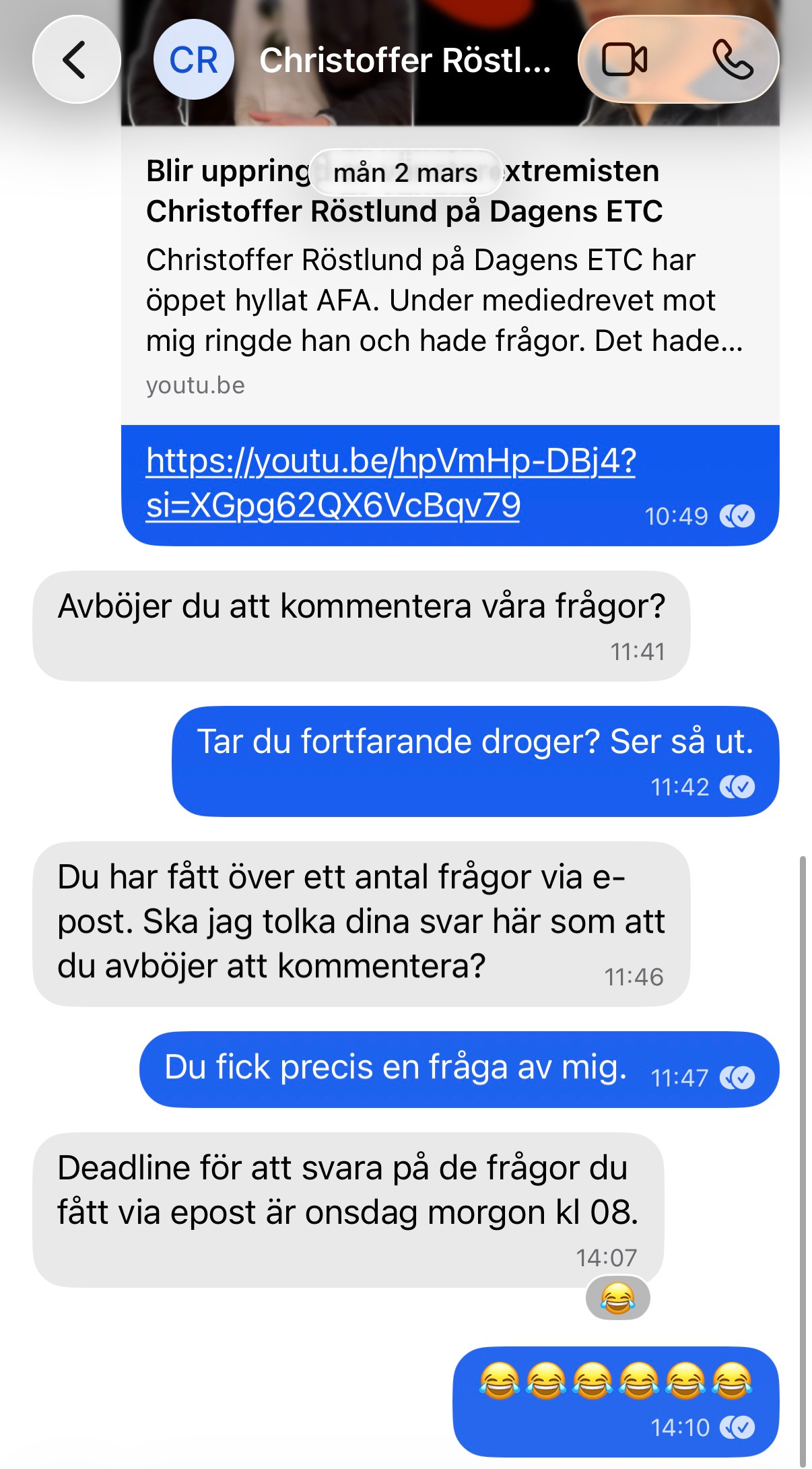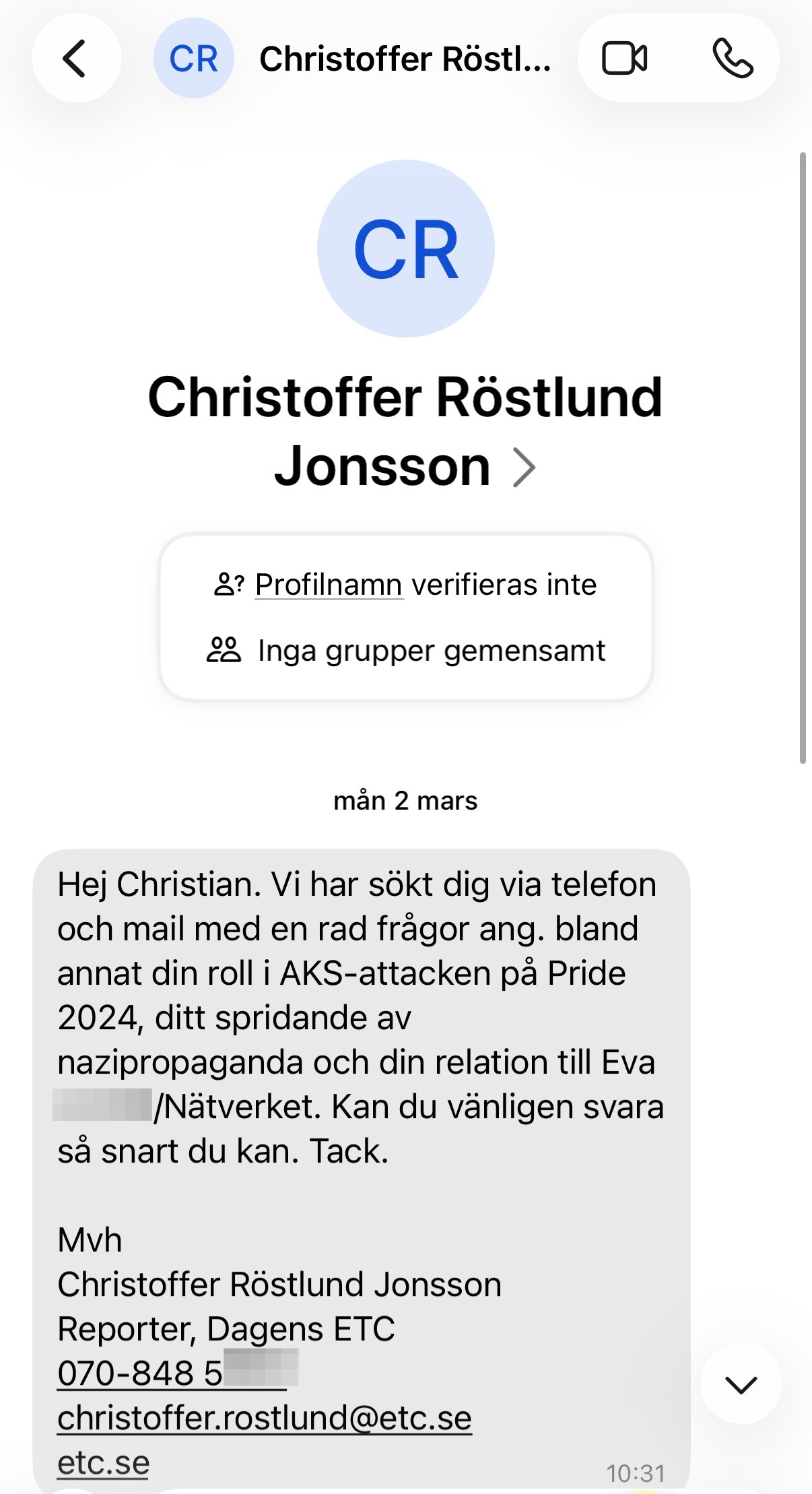 ETC-skribenten Christoffer Röstlund Jonsson skickade en rad meddelanden till mig på Signal med olika frågor som han ansåg att jag var skyldig att besvara. I ett av dem skrev han: “Svara så snart du kan.”