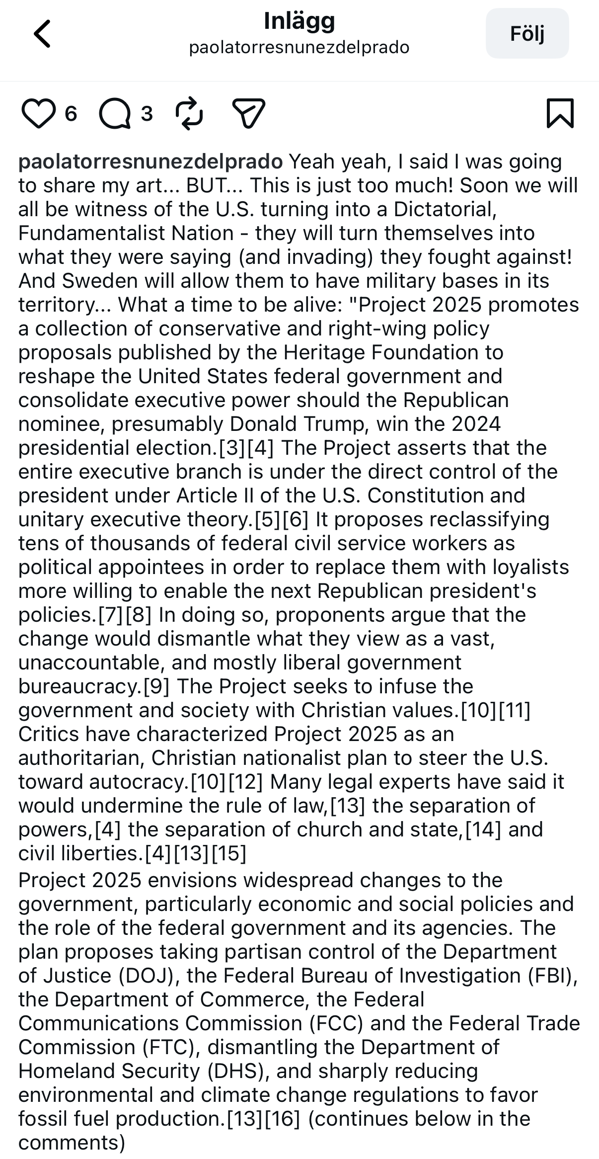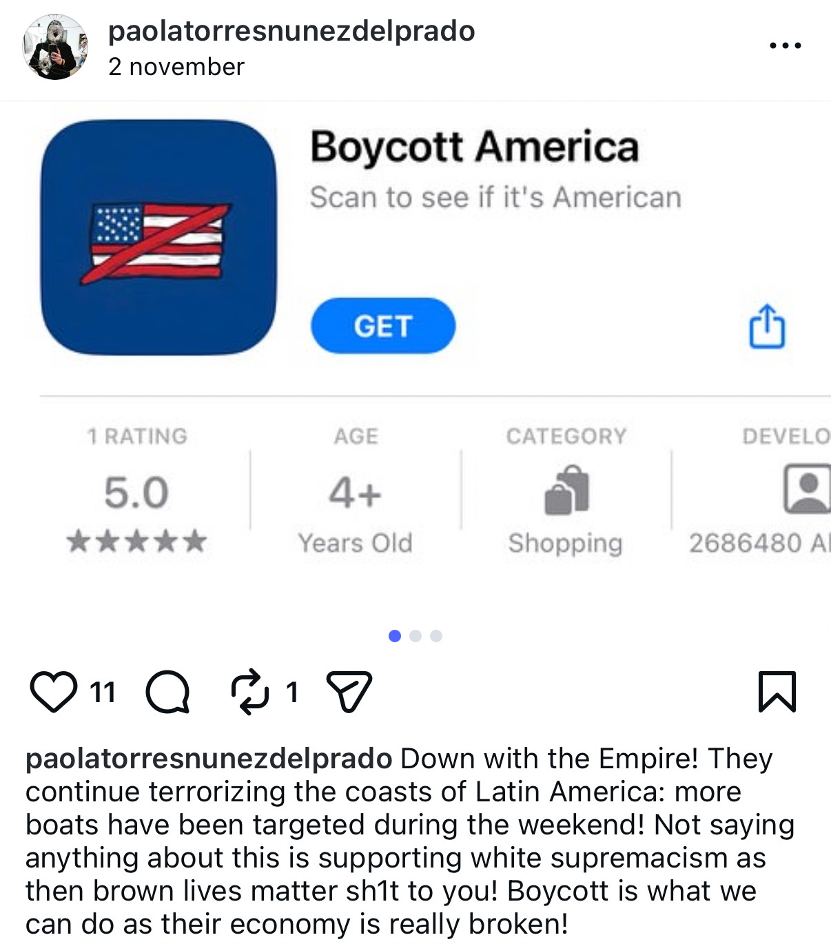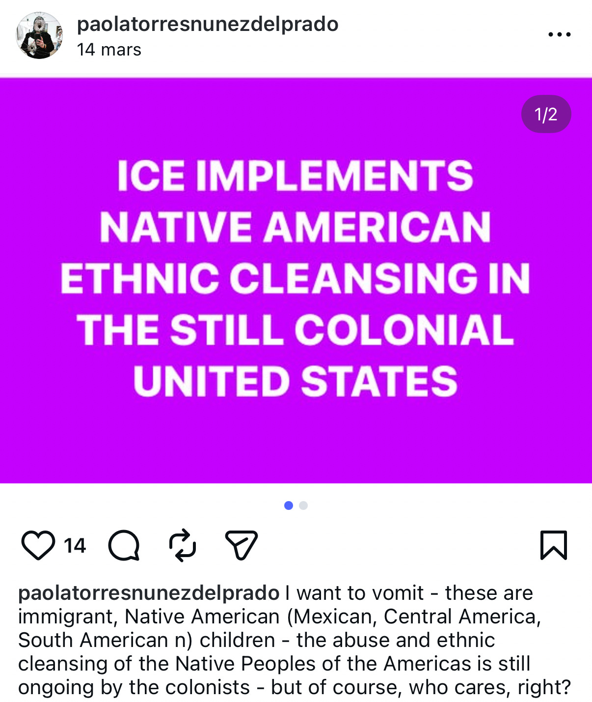 I sitt flöde visar Paola ett genomgående hat mot västvärlden. Hon uppmanar sina följare att ladda ner appen “Boycott America”, som listar amerikanska företag att undvika. Hon skriver “Ned med imperiet” och påstår att den amerikanska migrationsmyndigheten ICE bedriver “etnisk rensning”. Vidare påstår hon att Trumpadministrationen försöker förvandla USA till en “fundamentalistisk diktatur”.