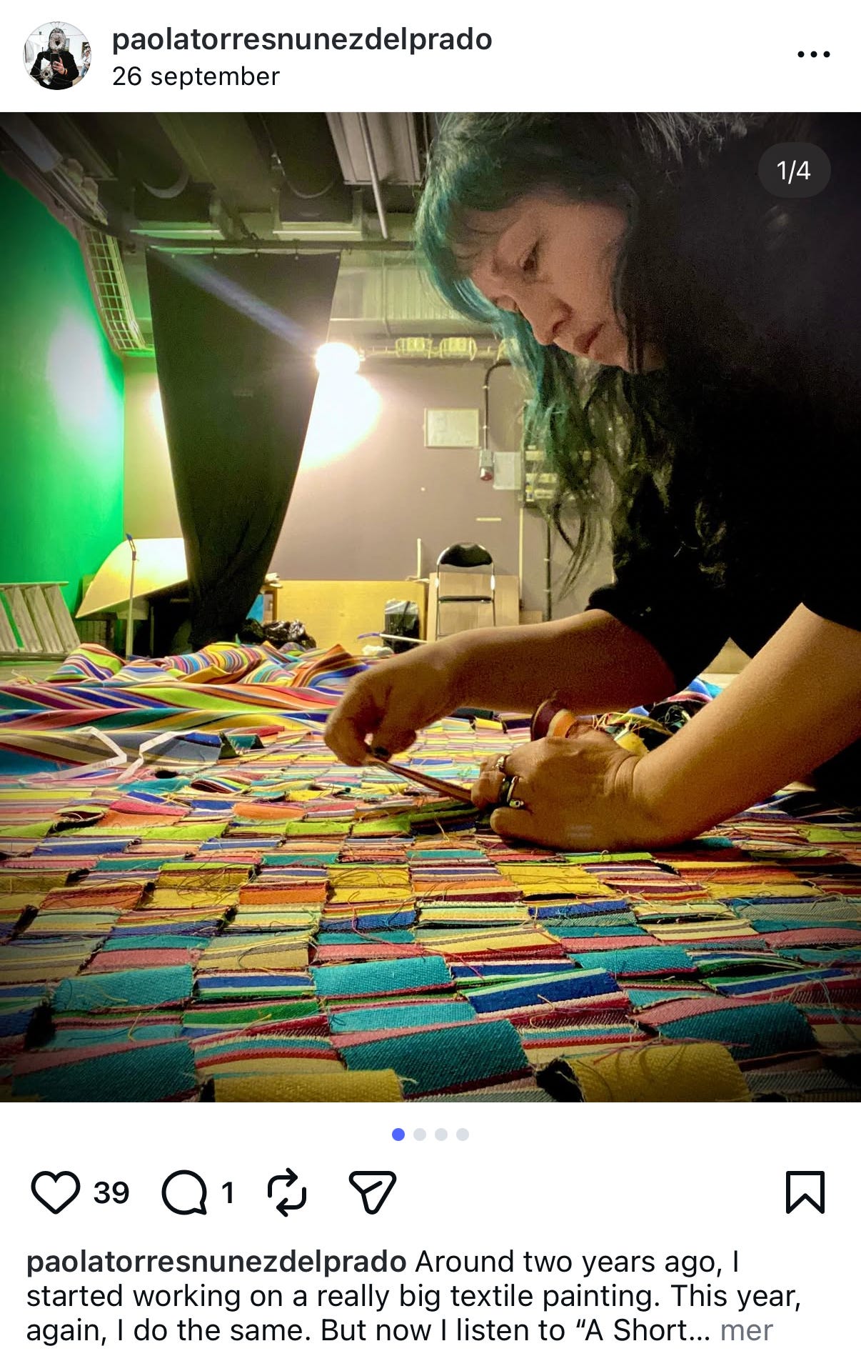 Vad hon producerar är däremot av tveksam verkshöjd. Bland hennes senaste projekt finns en rad olika nonsensprojekt ägnade åt att att knyta ihop tygtrasor i olika färger och kalla det för konst värdig nog att ställa ut på Bildmuseet. Ett annat projekt gick ut på att samla in lavar från höglandet i Tupicocha i Peru – vilket i Paolas värld räknas som “konstnärlig forskning”. Hon har också arbetat med att fotografera nakna personer i Sydamerika.