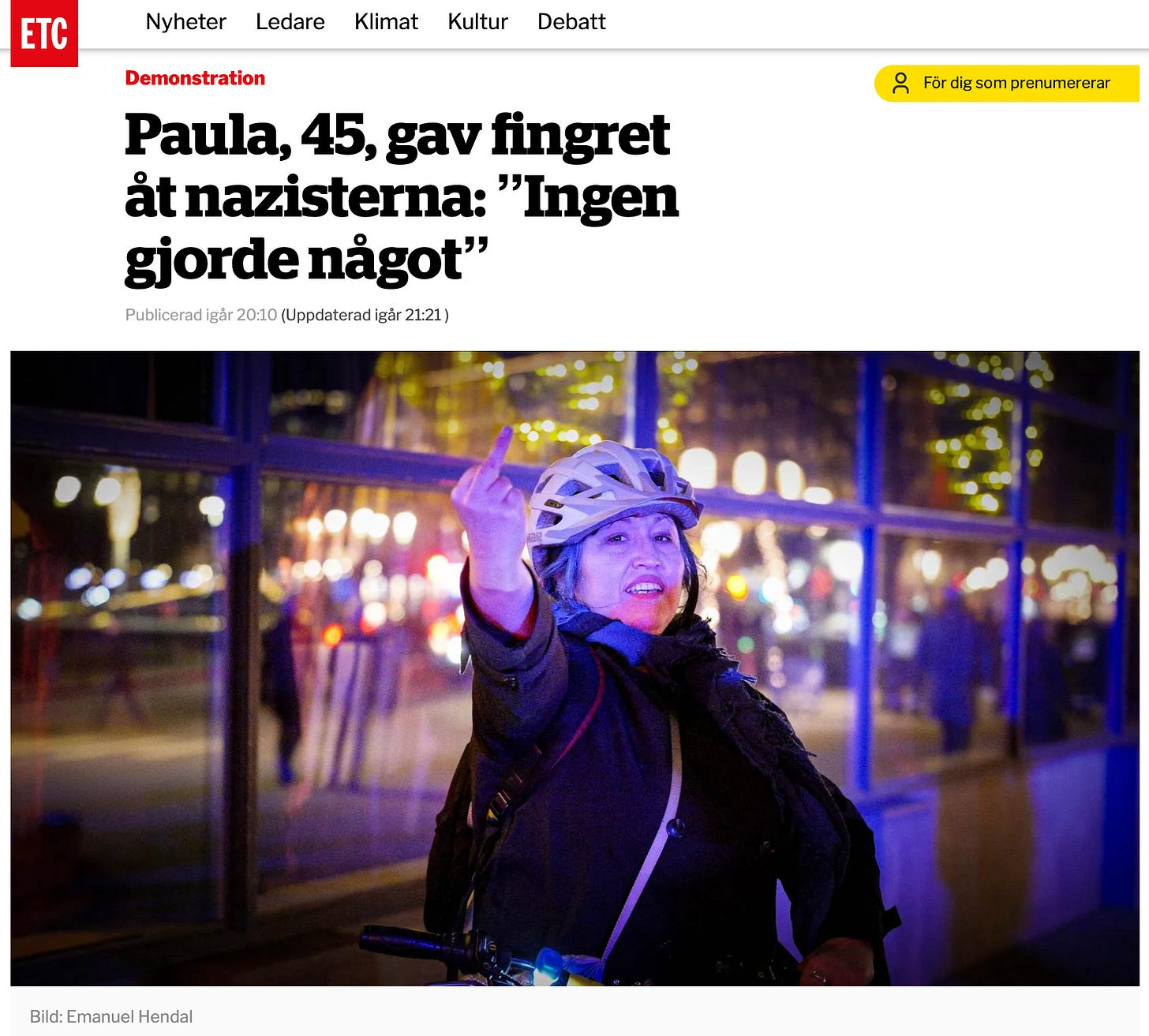 Igår kväll lyfte hatsajten Dagens ETC fram ”Paula, 45” – en påstådd helt vanlig stockholmare som spontant hoppade av cykeln och visade långfingret åt Aktivklubbs demonstrationståg, med motiveringen att ”ingen annan gjorde något”.