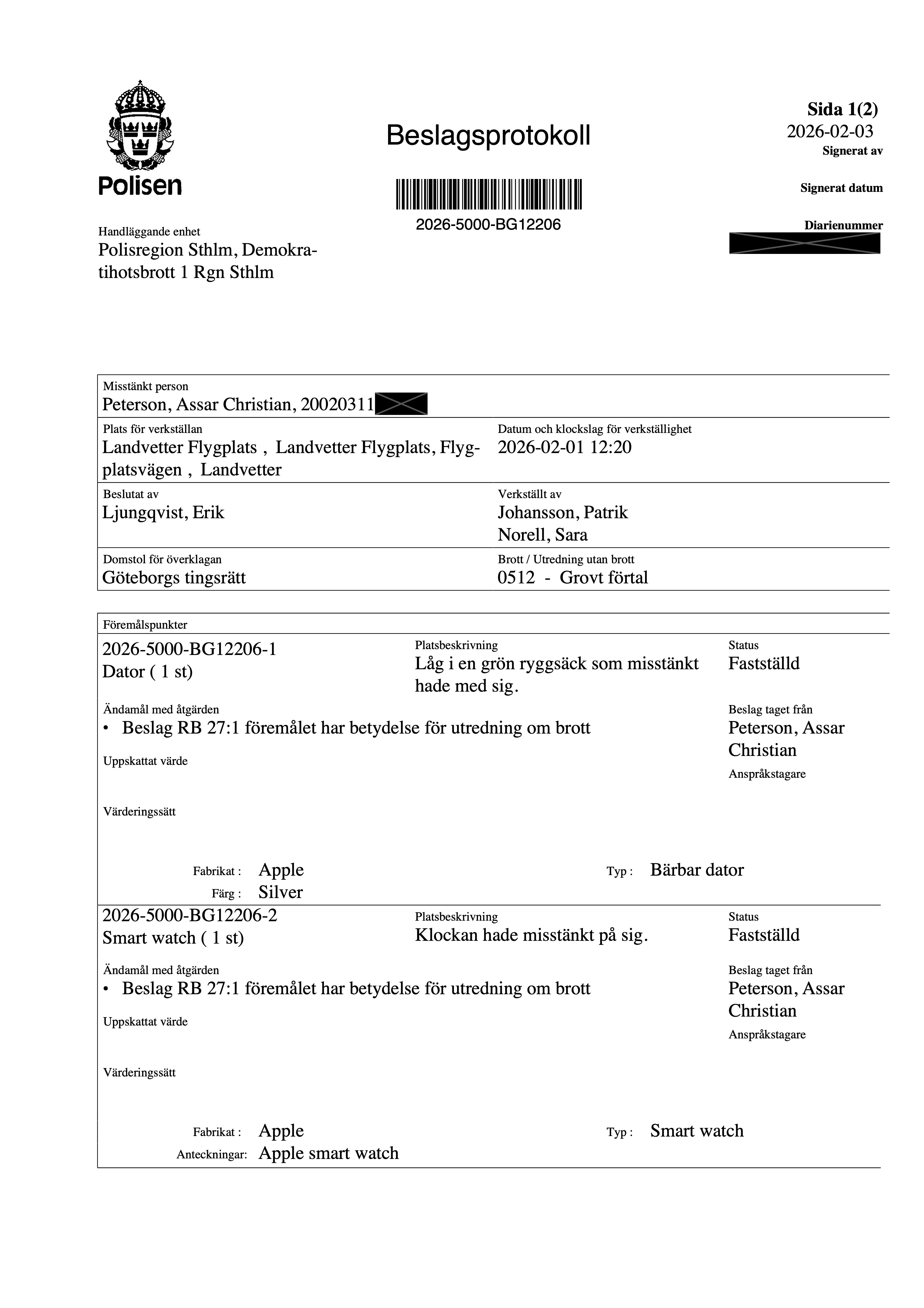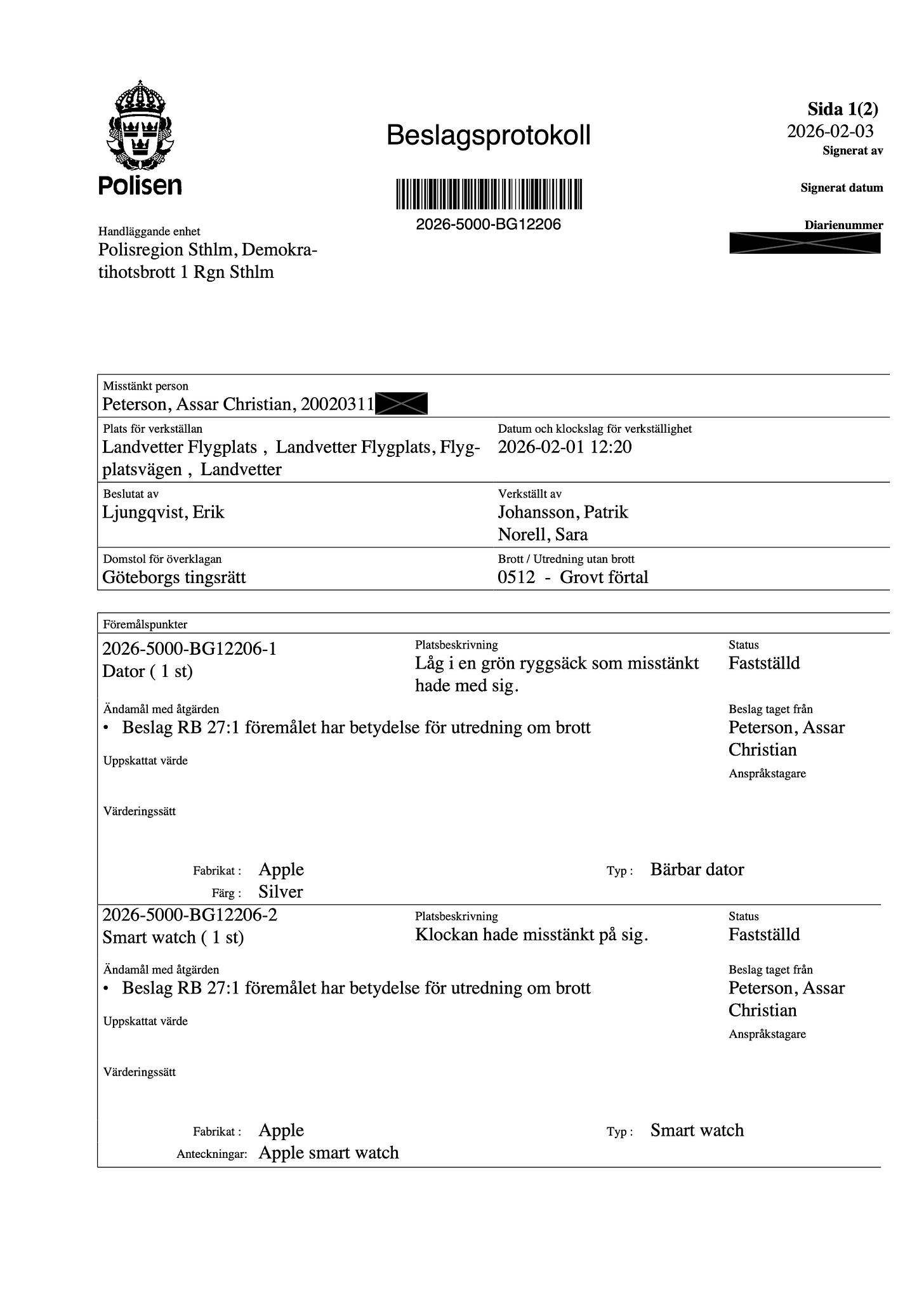 Poliserna började genomsöka mina väskor och beslagtog, i strid mot lagen, min dator, smartklocka, nätverksserver och ett minneskort. Allt togs som så kallade “bevis” i utredningen – trots mina invändningar om att enheterna innehöll källskyddat material och att jag arbetar som journalist. Det var uppenbart att det inte spelade någon roll. Rättssäkerheten var redan satt ur spel. Och snart fick jag veta varför.