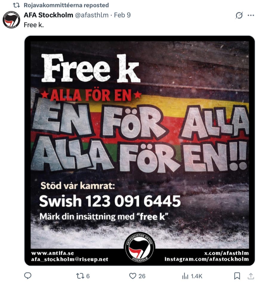Insamlingskampanjen via Fånggruppen drog snabbt igång. Gruppen bildades 2014 för att betala skadestånd efter att Joel Bjurströmer Almgren dömts för grov misshandel och mordförsök i samband med våldet i Kärrtorp 2013. AFA Stockholm var bland de första att marknadsföra insamlingen.