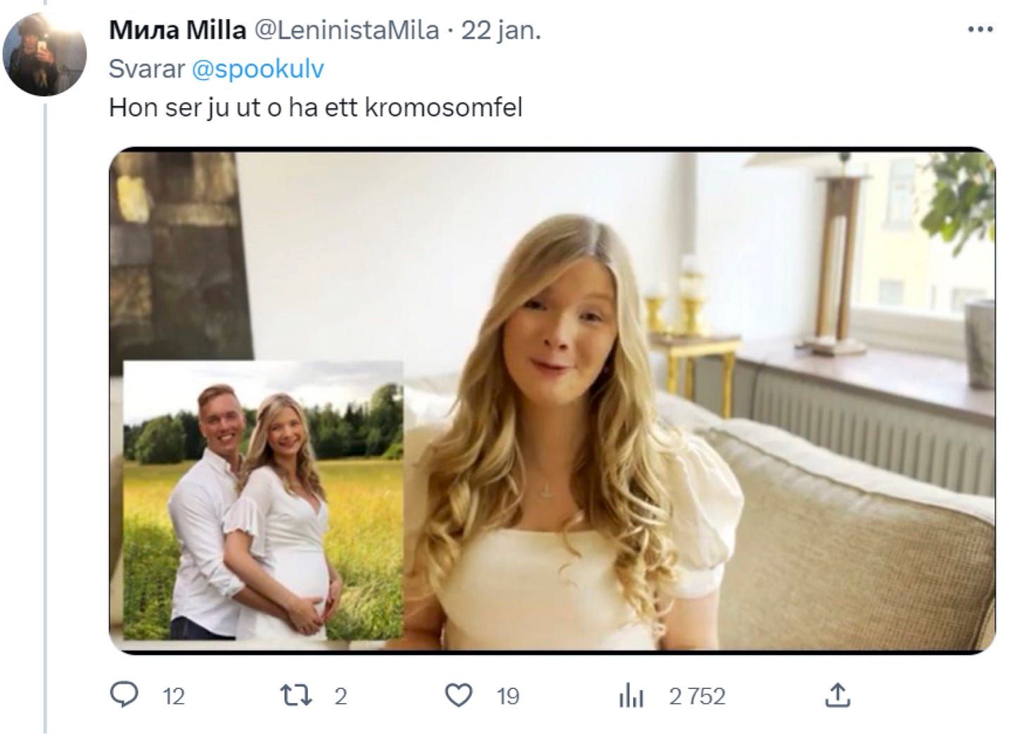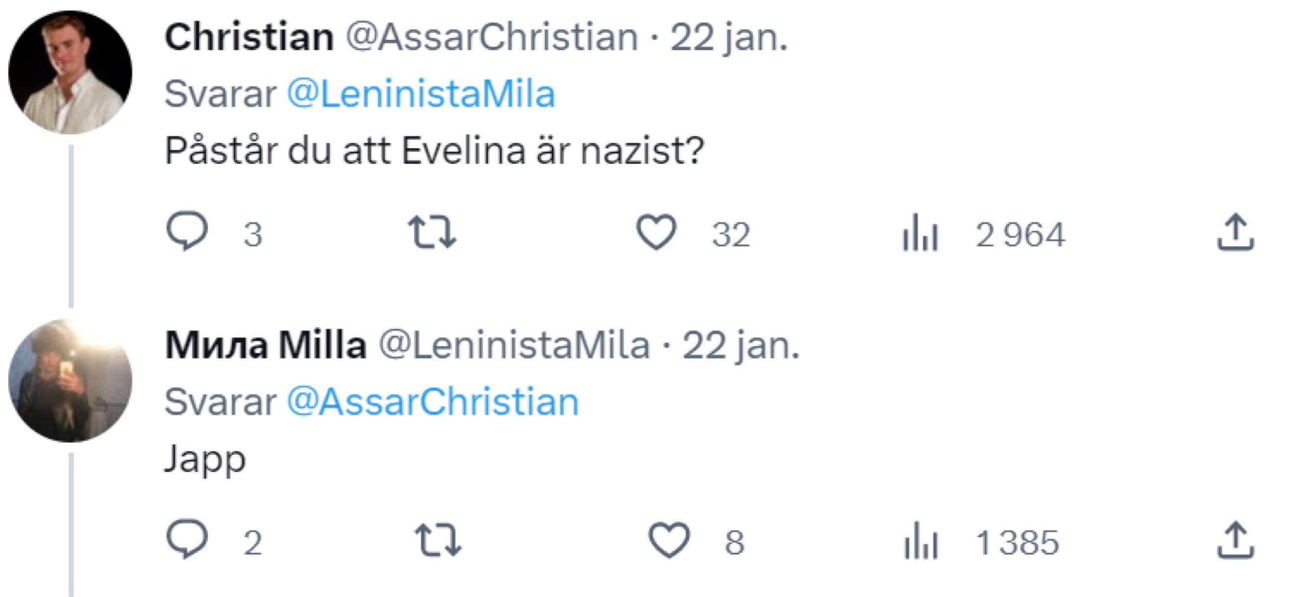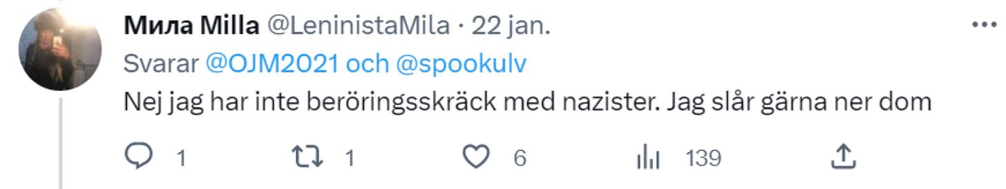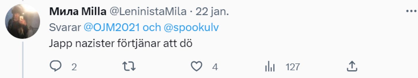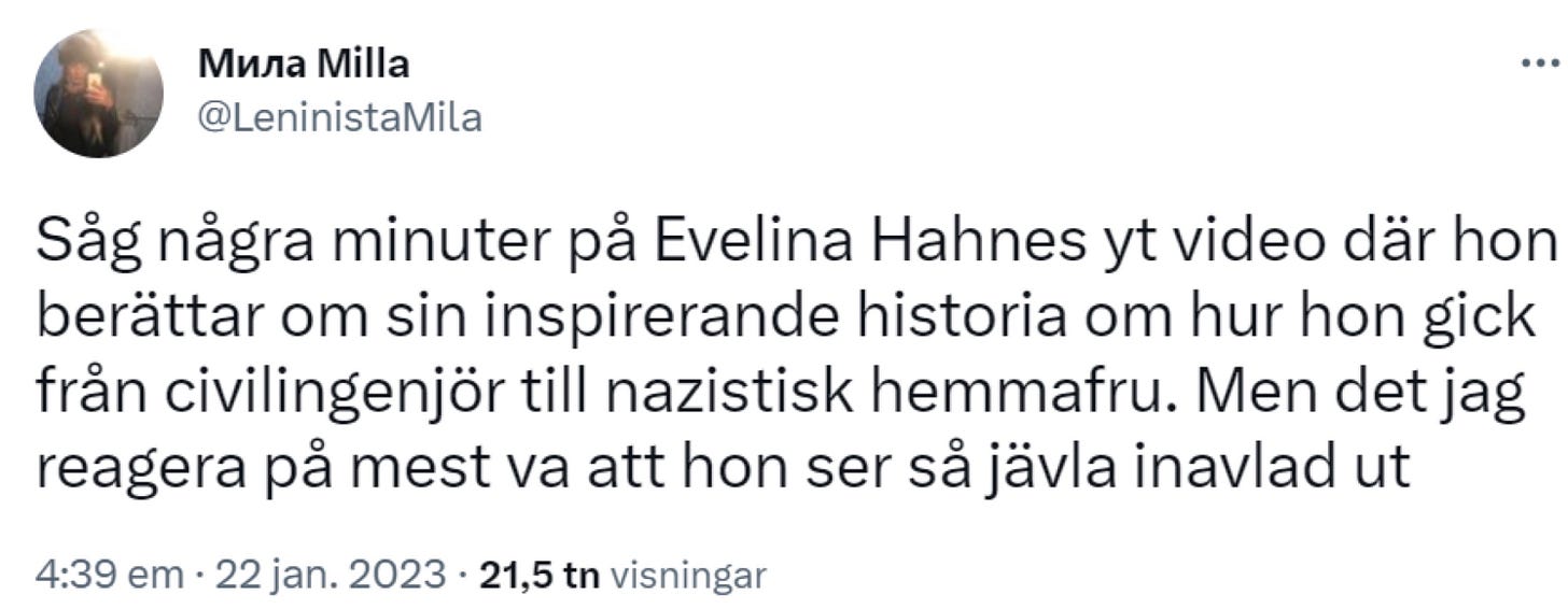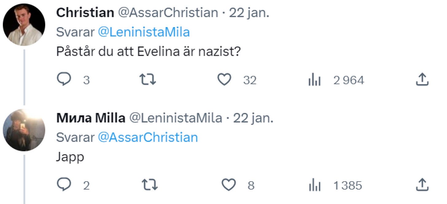 Det hela började med att Smilla Jalasjoki skrev ett inlägg på X där hon kallade Evelina Hahne för “nazist” samtidigt som hon spred uppgifter om att Hahne skulle vara utvecklingsstörd. Något som annars brukar ses som något positivt inom vänsterns intersektionella kränkthetsanalys av samhället.
