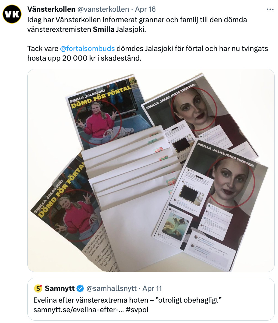 Under den senaste tiden har grupper såsom Vänsterkollen satt i system att använda vänsterns metoder mot dem själva. I detta fallet rörde det sig om att informera Smilla Jalasjokis grannar och familj.
