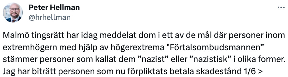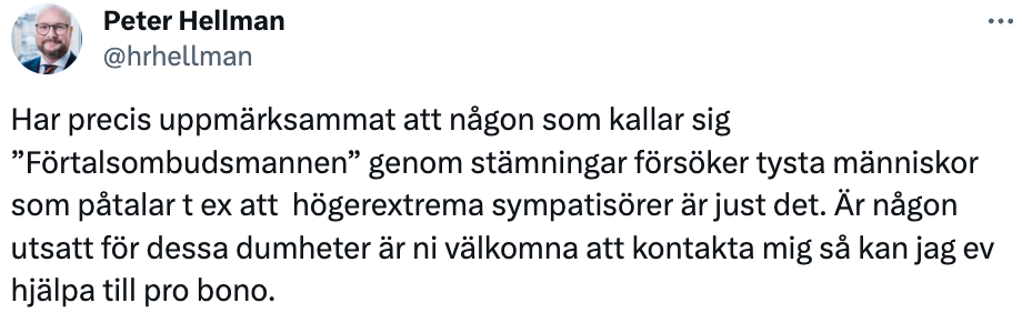 Ganska snart skulle Peter Hellman också skriva ett inlägg om påstådda och ospecificerade hot från icke namngivna “högerextrema aktörer”.