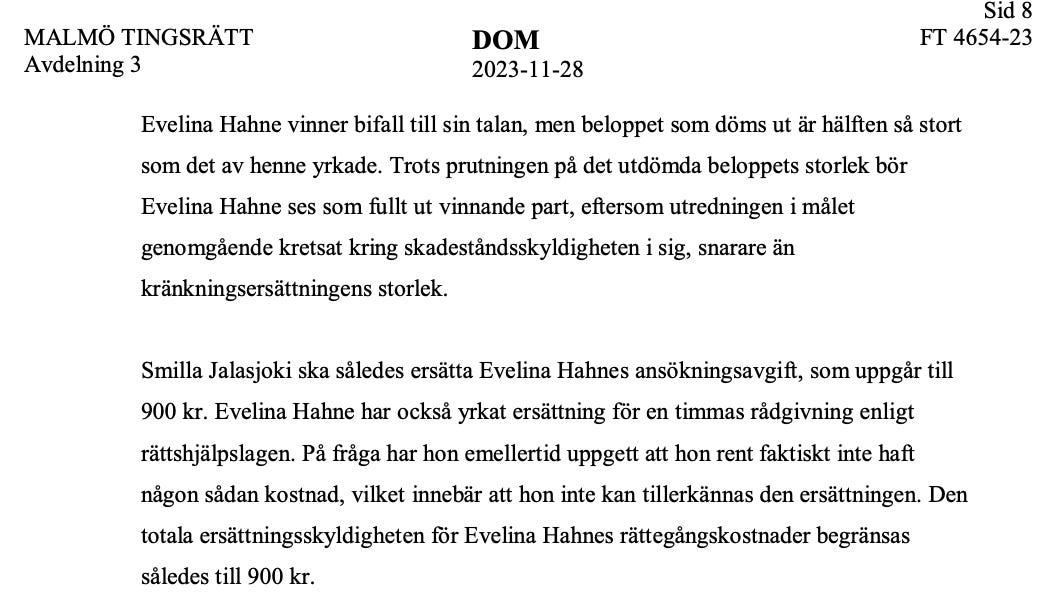 Självklart förlorade Smilla Jalasjoki även denna gången och dömdes återigen för förtal även om skadeståndet justerades till praxis-nivån på 10 000 kr: Utifrån de nivåer av kränkningsersättning som gäller efter den 1 juli 2022 bedömer tingsrätten att Evelina Hahne är skäligen kompenserad med ett skadestånd om 10 000 kr. På det sålunda utdömda beloppet löper dröjsmålsränta enligt 6 § räntelagen från dagen för gärningen till dess betalning sker.”