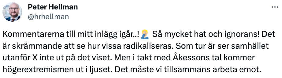 I ett inlägg på X uppmanar Hellman till handling mot vad han beskriver som hot, hat och radikalism från Sverigedemokraternas partiledare Jimmie Åkesson.