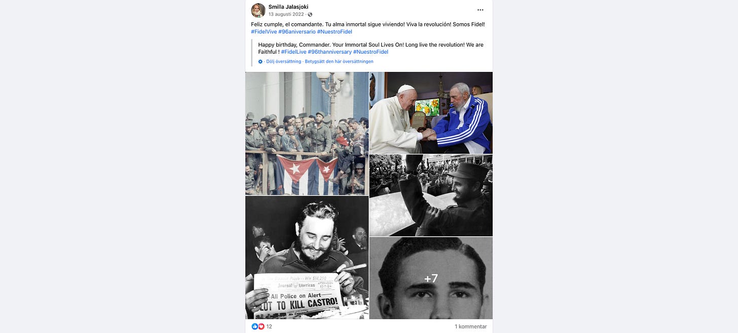 Smilla Jalasjoki är styrelsemedlem i regimtrogna Kubanska föreningen som är en konstellation av vänsterextremister som stödjer diktatorn Fidel Castro och hans auktoritära kommunistregim i Kuba.