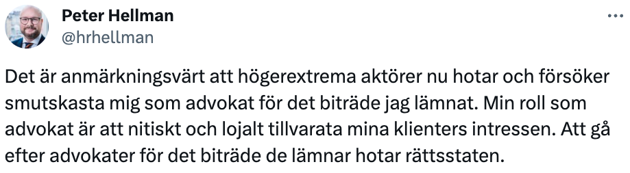 Hellman gick genast till attack där han återkom till sina utsvävningar om påstådda hot från högerextremister: ”Det är anmärkningsvärt att högerextrema aktörer nu hotar och försöker smutskasta mig som advokat för det biträde jag lämnat. Min roll som advokat är att nitiskt och lojalt tillvarata mina klienters intressen. Att gå efter advokater för det biträde de lämnar hotar rättsstaten.”