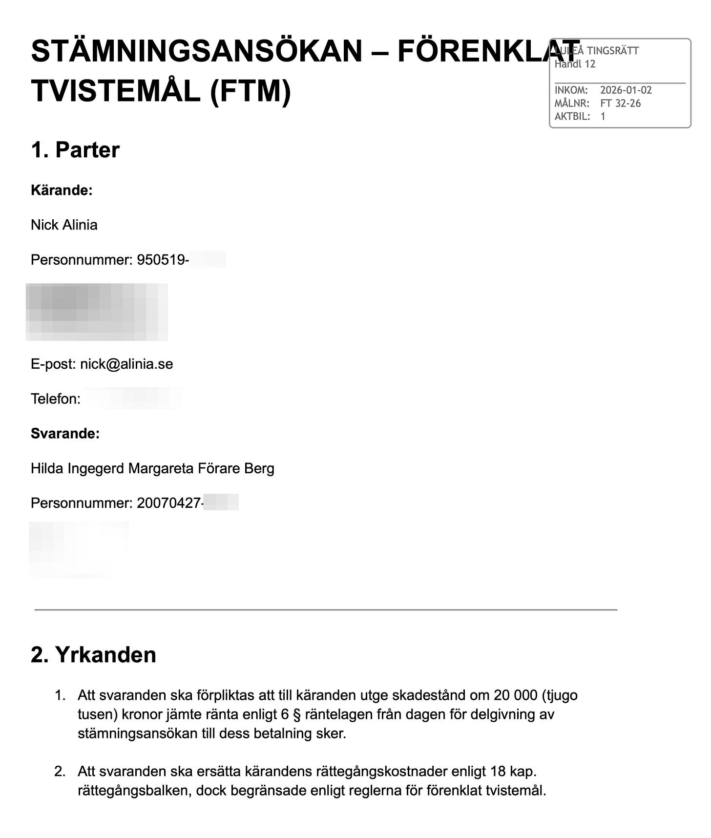 Till slut valde Nick Alinia att agera juridiskt. Hilda Förare Berg har nu stämts för förtal i Luleå tingsrätt, där hon krävs på ett skadestånd om 20 000 kronor.