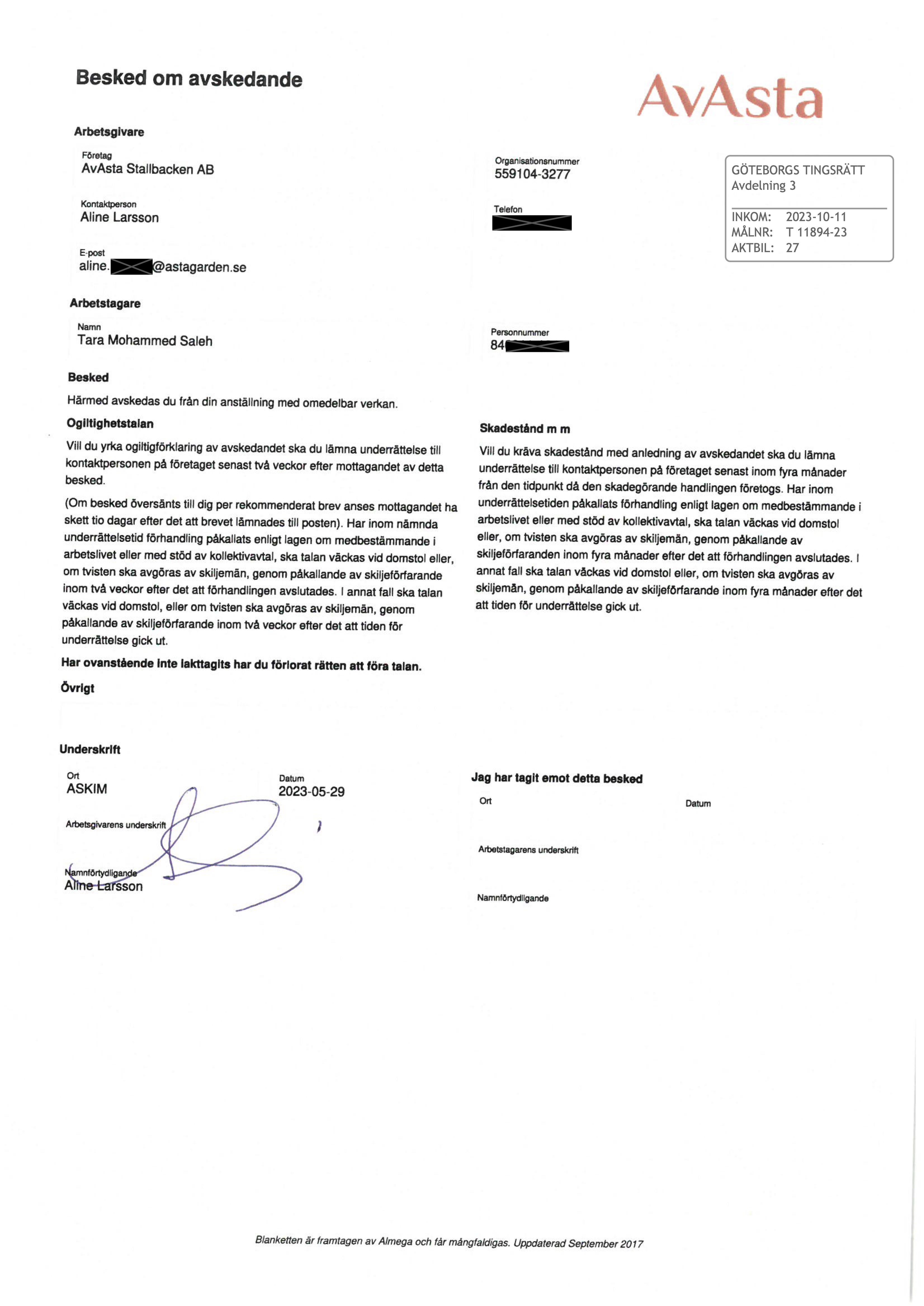 Tara Saleh blev avskedad efter att det avslöjats att hon arbetade på ett annat jobb – samtidigt som hon uppbar full sjukersättning. När detta kom fram valde hon, som den rättshaverist hon är, att stämma sin arbetsgivare. Men när det stod klart att hon skulle förlora processen drog hon tillbaka stämningen. Kvar blev hon med en skuld på 53 000 kronor i rättegångskostnader.