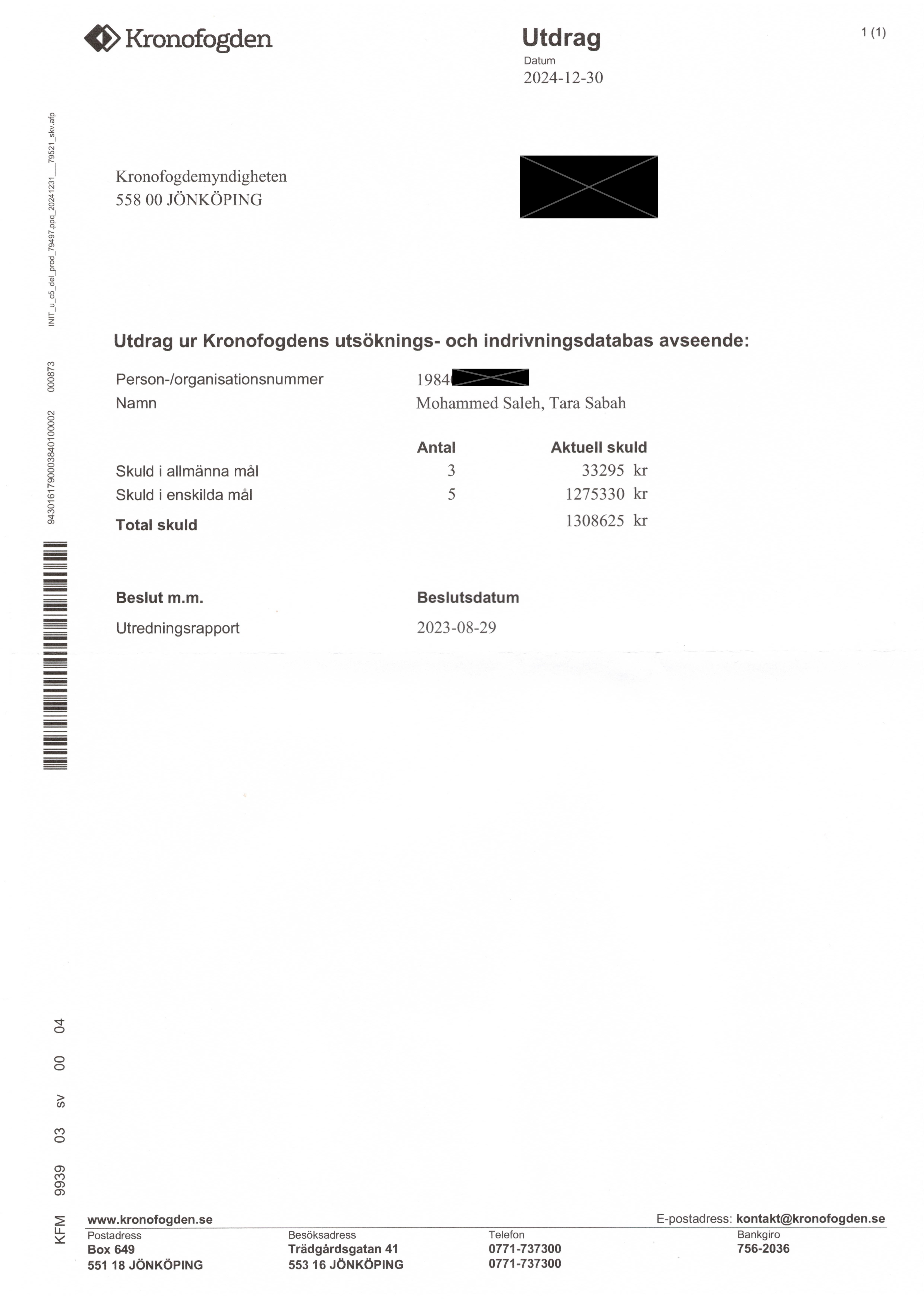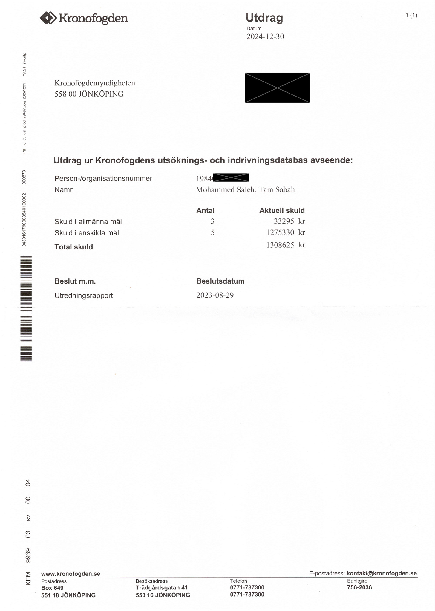 Den summan bleknar dock i jämförelse med Salehs totala skuldberg: 1,3 miljoner kronor i skatteskulder, inkassokrav och obetalda avgifter – registrerade hos Kronofogden. Trots detta lever hon ett liv som för de flesta svenskar i liknande situation vore fullständigt otänkbart.