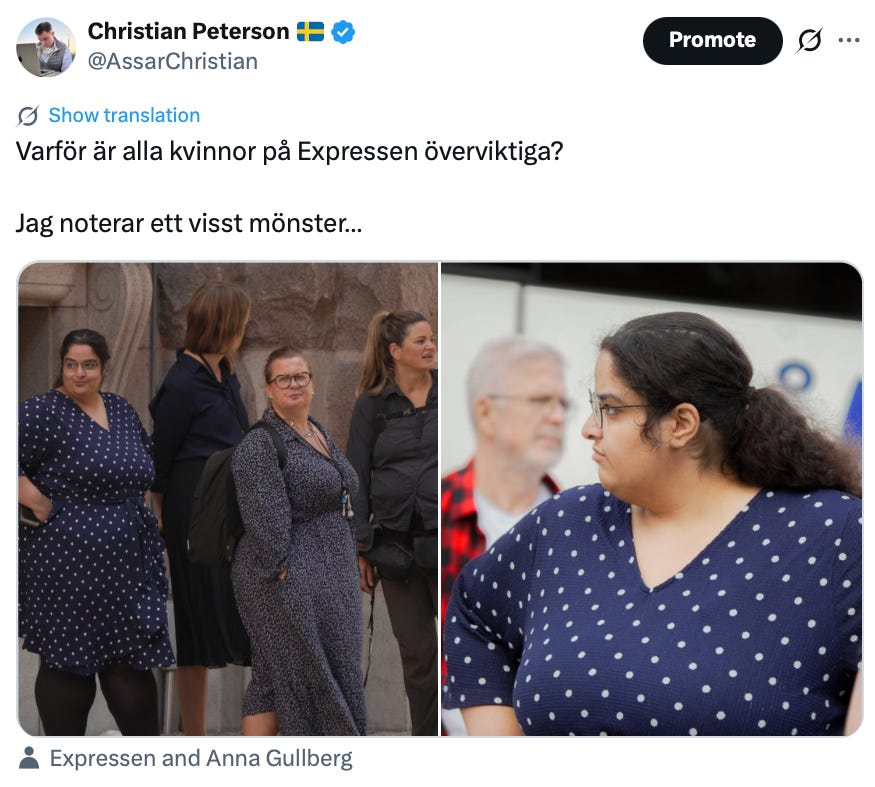 Sedan dess har jag i princip inte haft någon kontakt med henne. Eller jo – vid ett tillfälle påpekade jag att majoriteten av kvinnorna från Expressen som syntes vid riksdagens öppnande var rejält överviktiga.