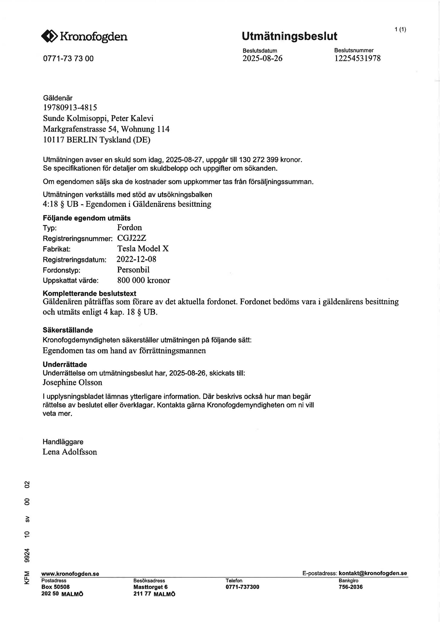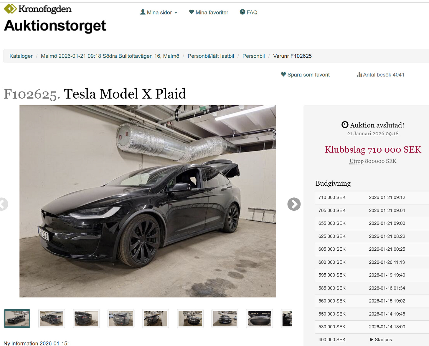Teslan såldes av Kronofogden för 710 000 kronor. Pengar som nu går till att betala av de tre dömdas skadestånd på över 120 miljoner kronor.