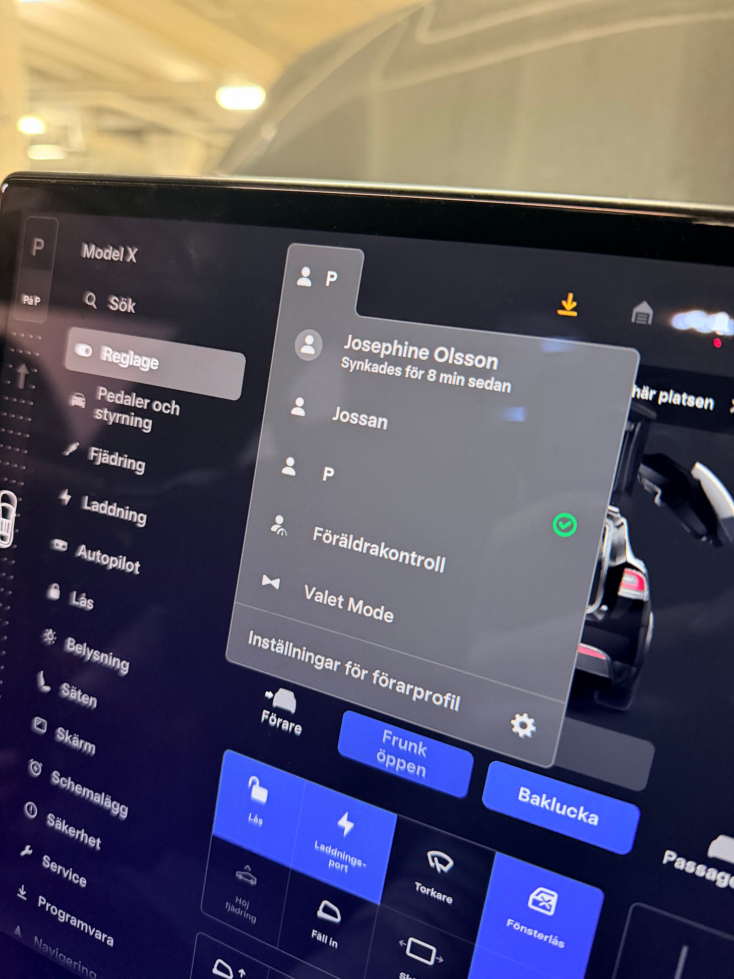 Vid Kronofogdens visning av bilen passade jag på att undersöka och dokumentera färddatorn. Där fanns ingen användarprofil för Josephines pappa, Lennart Olsson. Däremot fanns, utöver Josephines profil, ytterligare en – märkt ”P” – registrerad som huvudanvändare.