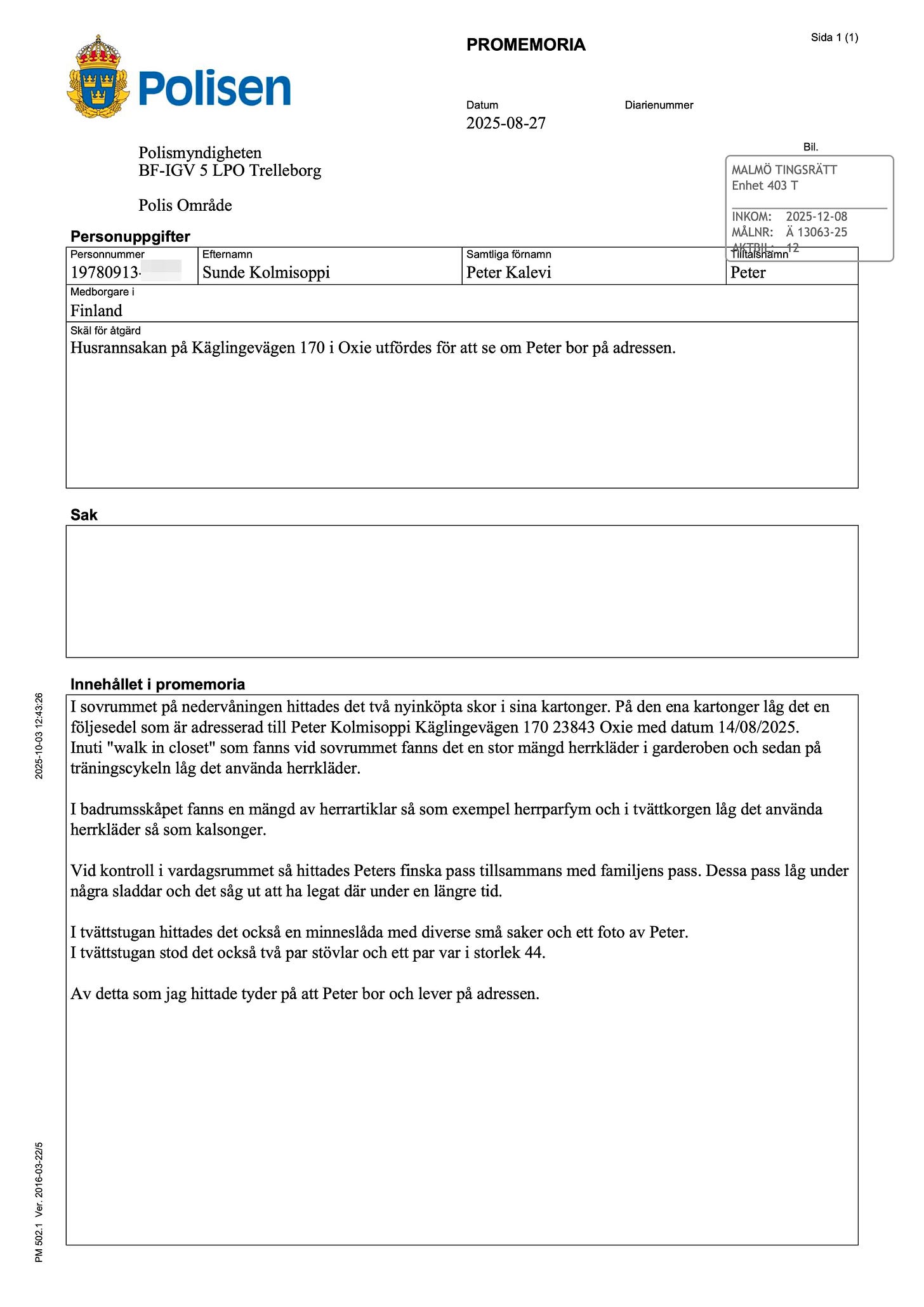 I skrivelsen till JO hävdades dessutom att Peter skulle ha skyddade personuppgifter på grund av en påstådd hotbild. En lögn som inte håller vid kontroll med Skatteverket – och det är dessutom inte möjligt att ha skyddade personuppgifter efter att man har utvandrat.