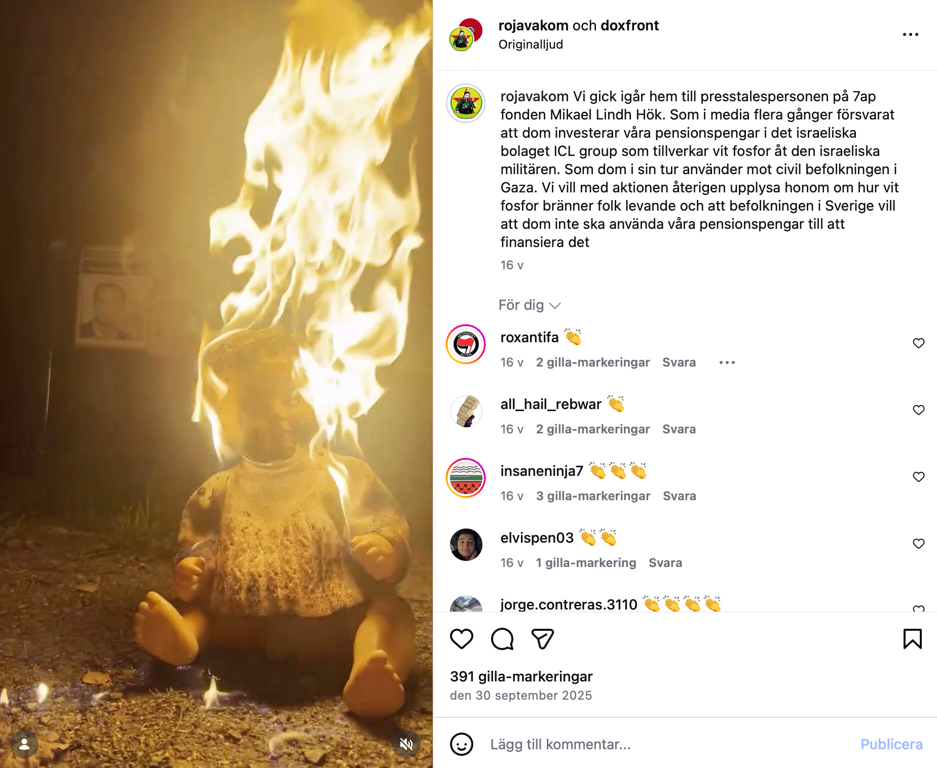 Under det senaste året har Rojavakommittéerna riktat in sig på att trakassera sina upplevda meningsmotståndare genom hembesök, affischering, skadegörelse – och genom att bränna en docka utanför bostaden till presstalespersonen för AP7 Aktiefond.