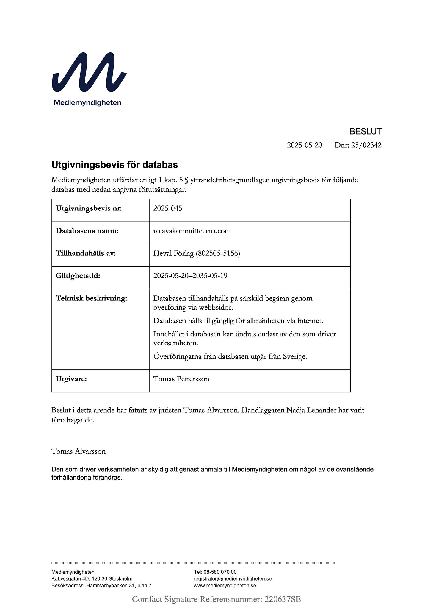 På hemsidan “rojavakommitteerna.com” publicerar organisationen pressmeddelanden, opinionsartiklar och uthängningar av meningsmotståndare. Sajten har skaffat utgivningsbevis hos Mediemyndigheten genom att registrera Tomas Mats Ove Pettersson (född 1979-12-21) som straffrättslig målvakt. Detta försvårar polisens möjligheter att agera mot gruppen, eftersom de exempelvis kan hävda källskydd om mobiltelefoner eller annan utrustning beslagtas i samband med brottsutredningar.