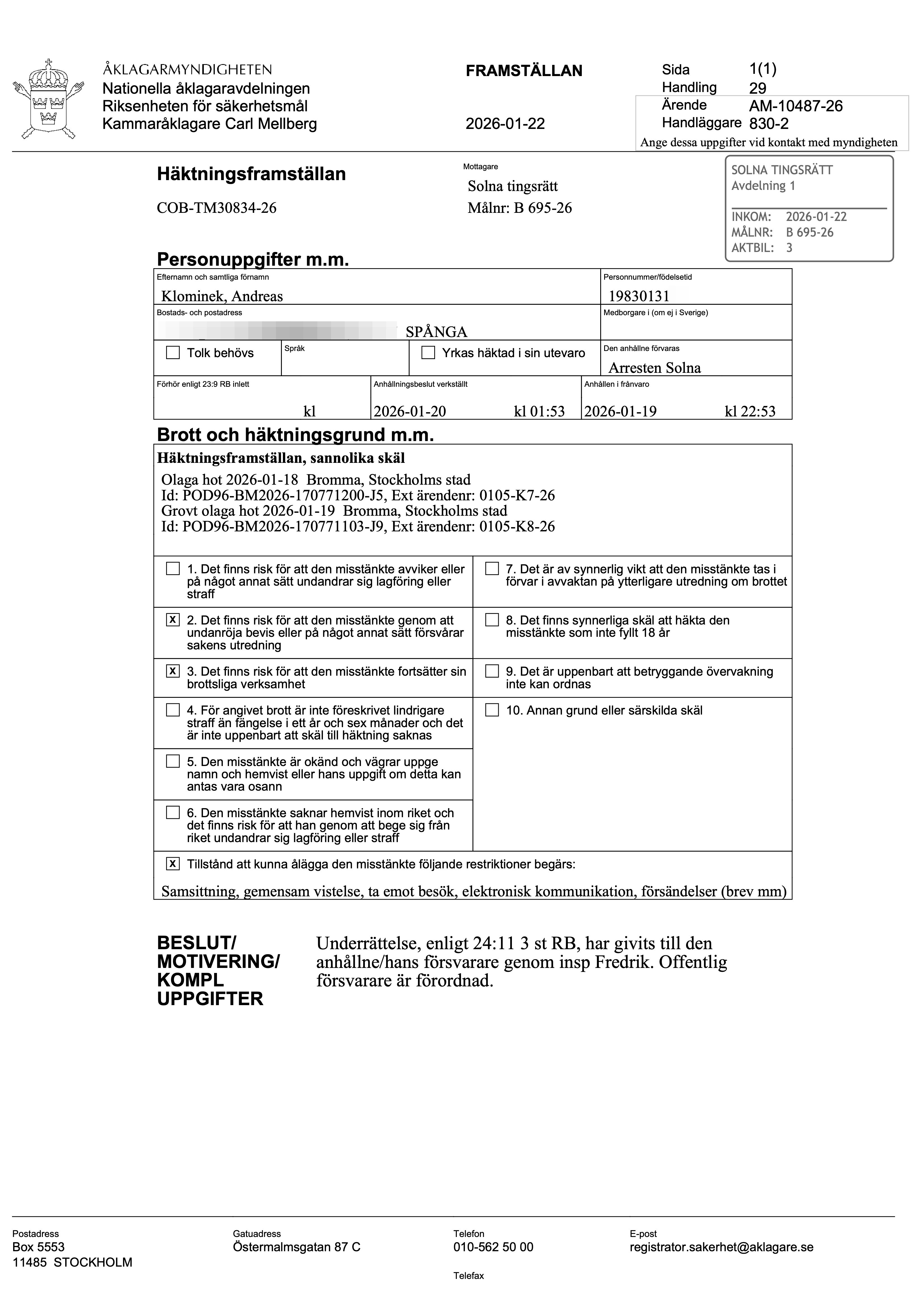 Kort efter att hotet publicerats i sociala medier greps Klominek av Säkerhetspolisen, misstänkt för olaga hot samt grovt olaga hot riktat mot de båda ministrarna. Han är nu häktad av Solna tingsrätt, med hänvisning till risken att han fortsätter sin brottsliga verksamhet.
