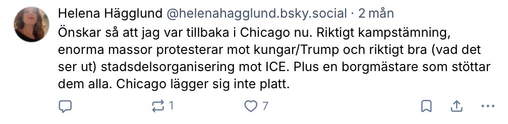 In addition to encouraging armed struggle against Jewish interests and engagement in the terrorist-designated Antifa milieu, Helena Hägglund has on several occasions expressed support for improper interference directed at employees of U.S. immigration authorities. In a post on Bluesky, she refers to disruptions targeting officials as a form of “neighborhood organizing.”