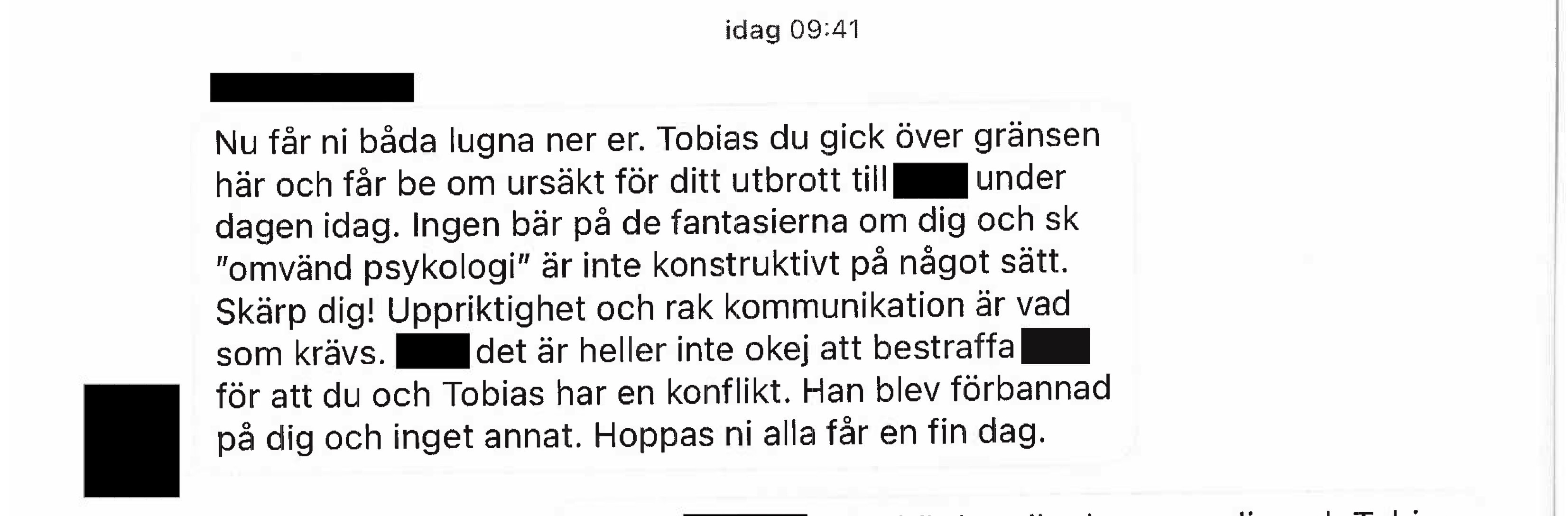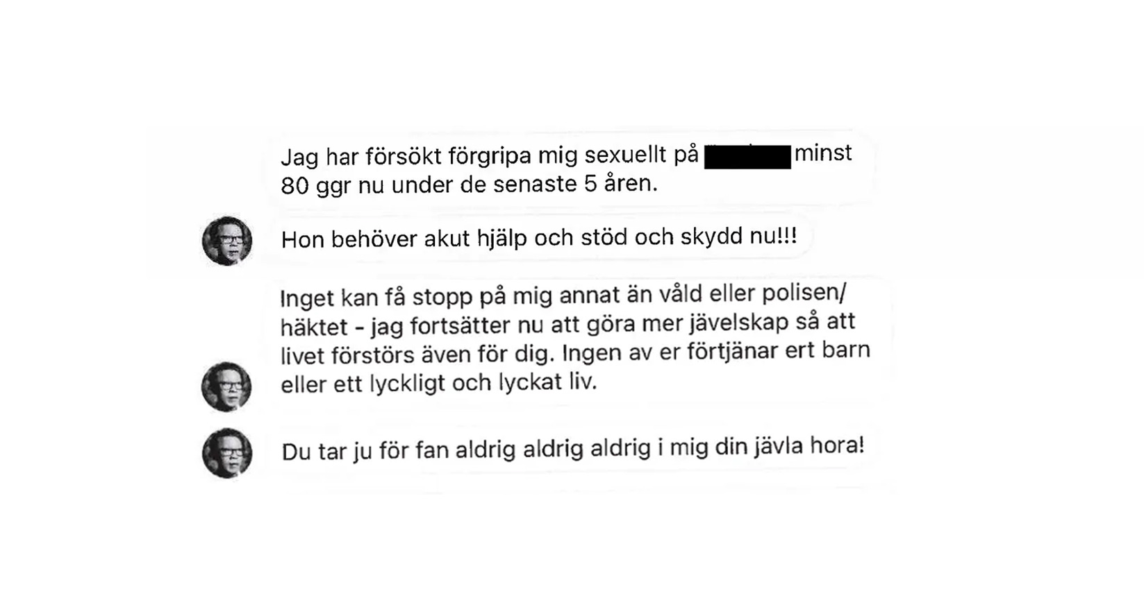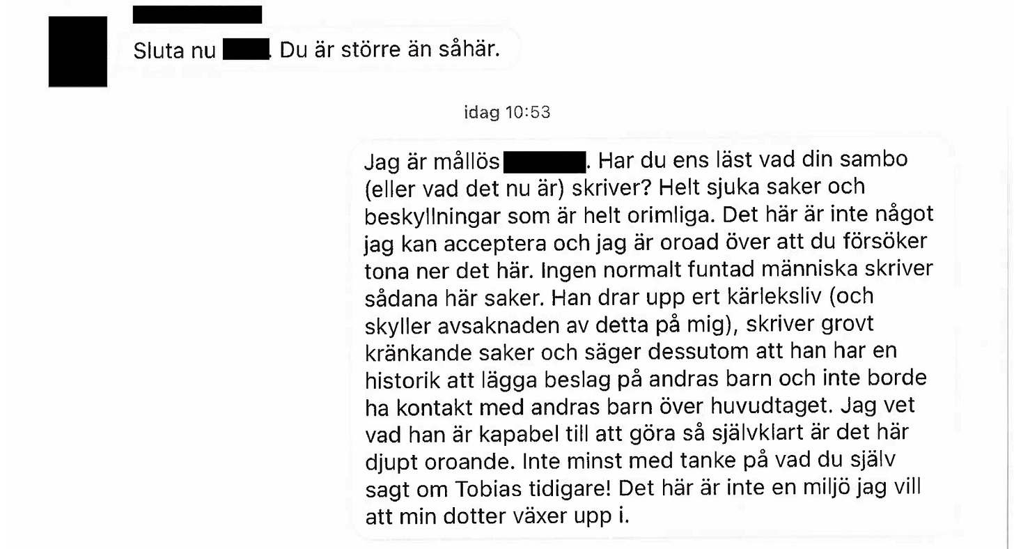 ”Det här är inget jag kan acceptera, och jag är oroad över att du försöker tona ner det här. Ingen normalt funtad människa skriver sådana här saker. Han drar upp ert kärleksliv – och skyller avsaknaden av detta på mig – skriver grovt kränkande saker och säger dessutom att han har en historik av att lägga beslag på andras barn och inte borde ha kontakt med andras barn över huvud taget.”