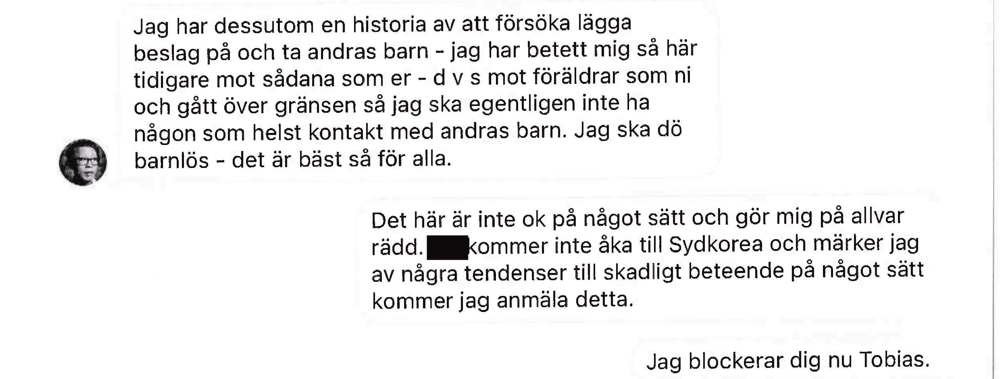Situationen blev inte mindre allvarlig av att Hübinette hade planerat att ta med barnet på en resa till Sydkorea. Det väckte djup oro hos de övriga papporna. Inte minst eftersom Hübinette själv i chatten har skrivit att han har en historia av att ge sig på barn.