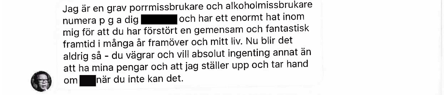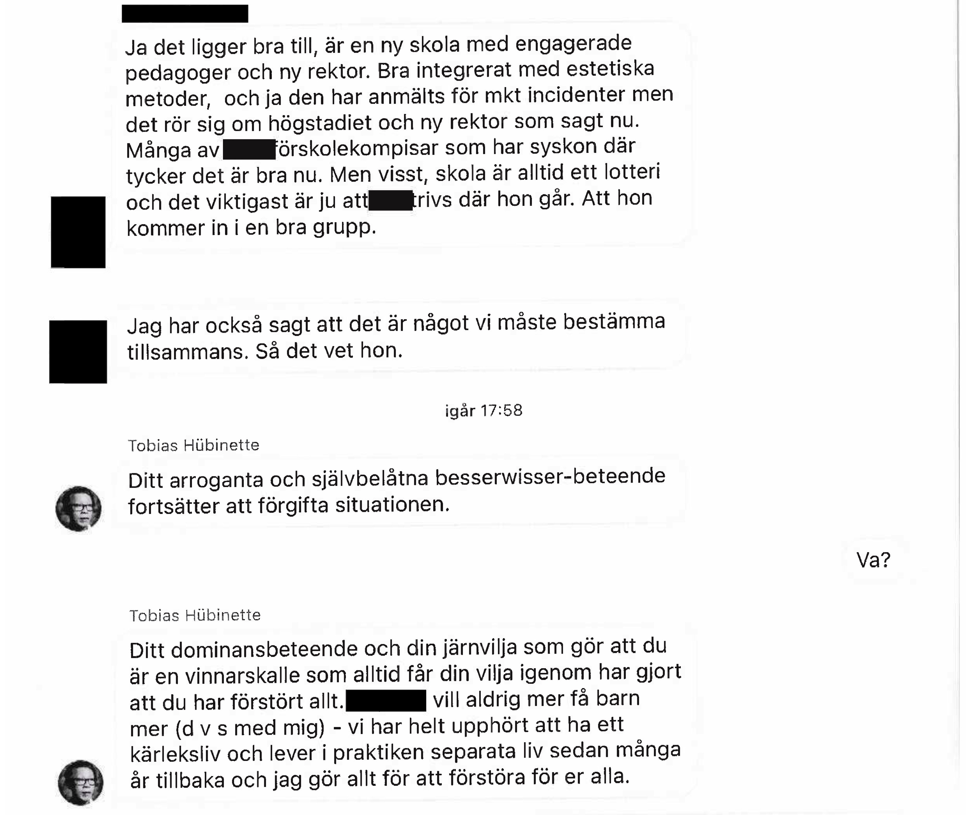 I den 21 sidor långa SMS-konversation som polisen säkrat lägger Hübinette själv skulden för sitt alkohol- och porrmissbruk på sambon och de andra papporna, samtidigt som han riktar hot om att ”förstöra livet” för dem.