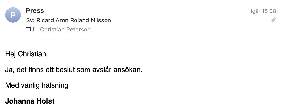 Ricard Nilsson har inte velat svara på mina frågor om sin närvaro vid pressträffen, om han blev igenkänd eller om någon från säkerhetspersonalen vid Regeringskansliet kontaktade honom.