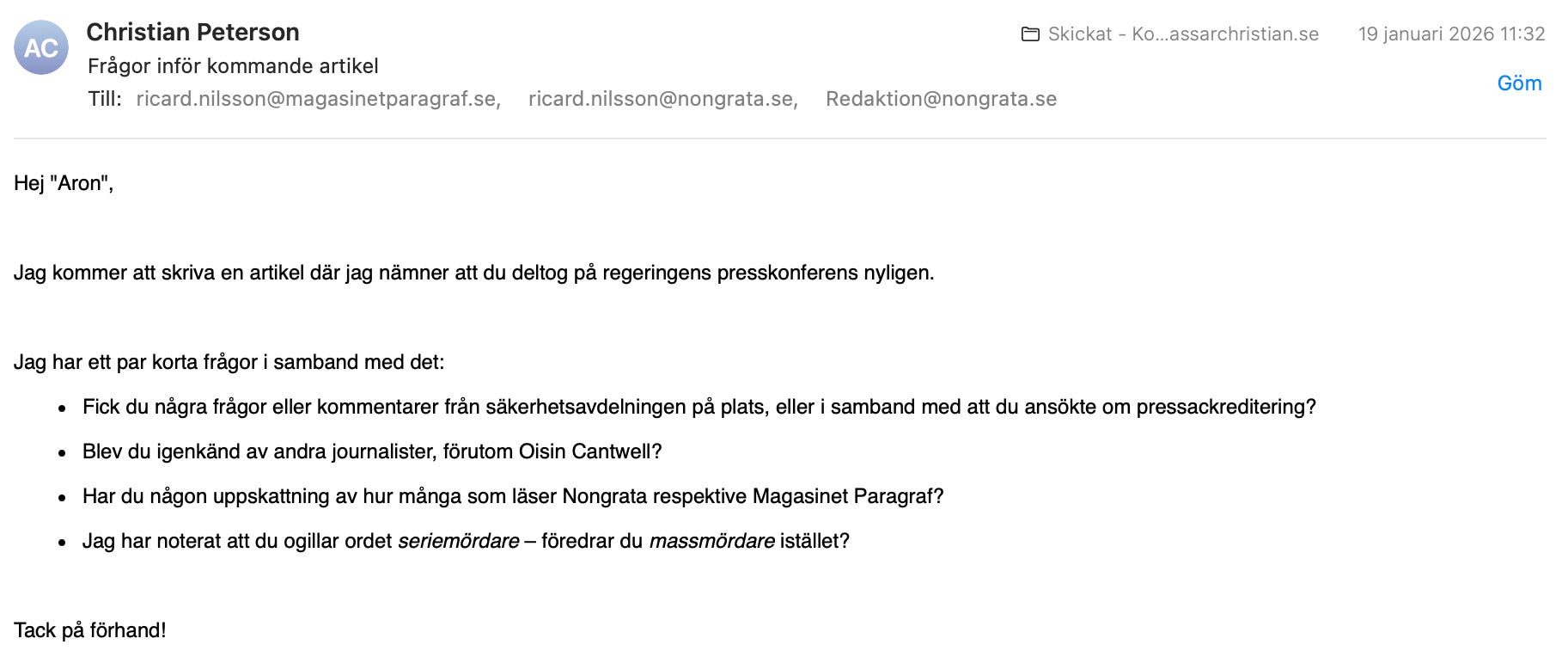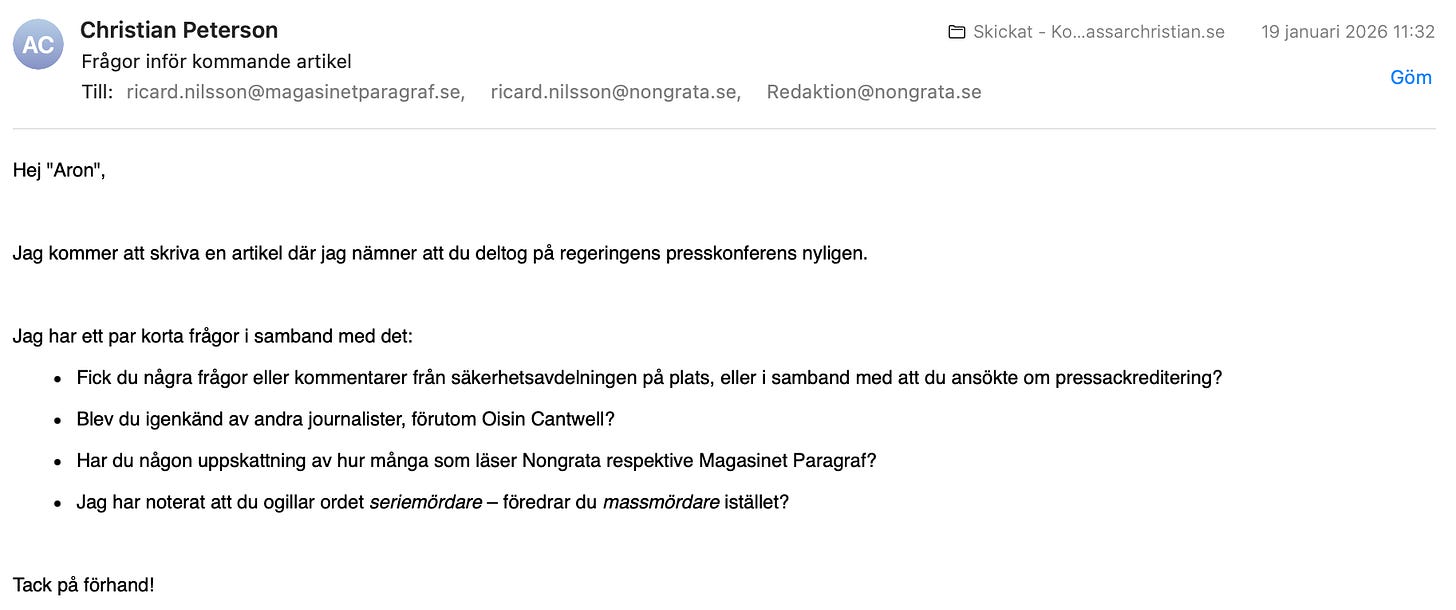 Den 15 januari 2026 höll regeringen en pressträff om skärpta straff för grova brott. På plats bland journalisterna fanns Ricard Aron Roland Nilsson (19760410) – dömd för trippelmord, fortfarande under villkorlig dom, och med en “pressbricka” runt halsen.
