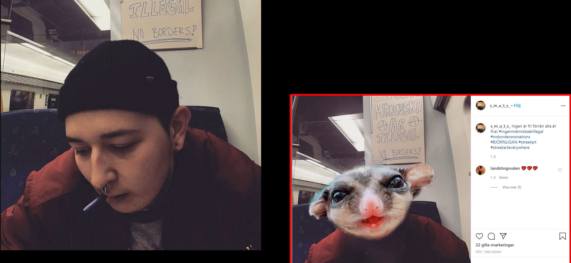 Ett av dessa konton är Andreas Krummels privata instagram-konto där hon har publicerat en bild, med en dekal föreställandes en mus, som täckte för hennes ansikte. En bild som vi senare jämförde med en nästan identisk bild från vårt arkiv.