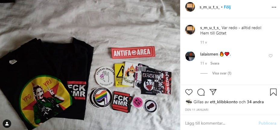 I ett annat inlägg som Krummel publicerade på Instagram delade hon med sig av en bild på ett klistermärk med det polishatande slagordet ACAB (All tops are bastards). Till vänster i bild finns även en tröja från den vänsterextrema gruppen Rojavakommitéerna som är en grupp bestående av flera före detta aktivister från den numera nedlagda terrorgruppen Revolutionära Fronten som samlar in pengar till den terrorstämplade kurdmilisen PKK.